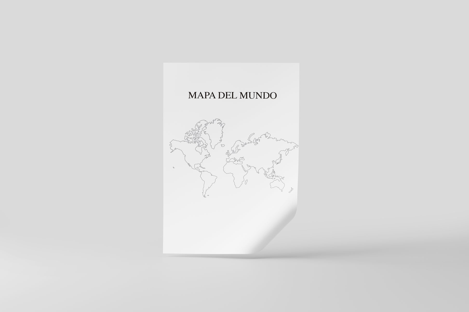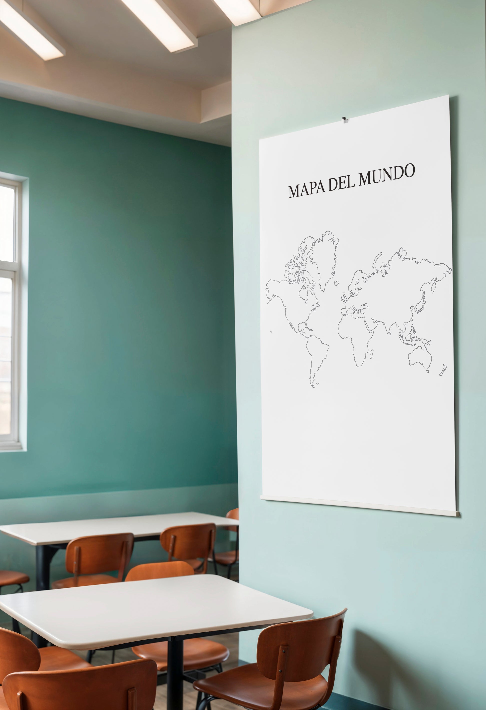 This artwork features a simple outlined world map with Spanish title “Mapa del Mundo”, evoking classic classroom posters and institutional wall charts. Its neutral palette and uncluttered design make it ideal for academic settings, libraries, offices, or as a subtle background prop in film, television, or editorial photography. The understated linework allows it to blend naturally into realistic school, government, or domestic interiors without drawing unwanted attention on camera.