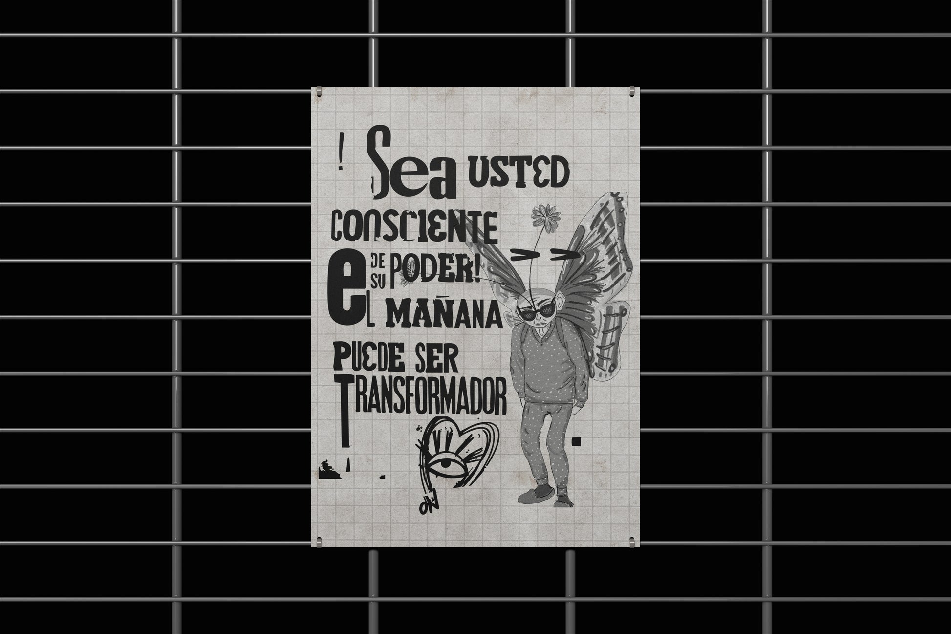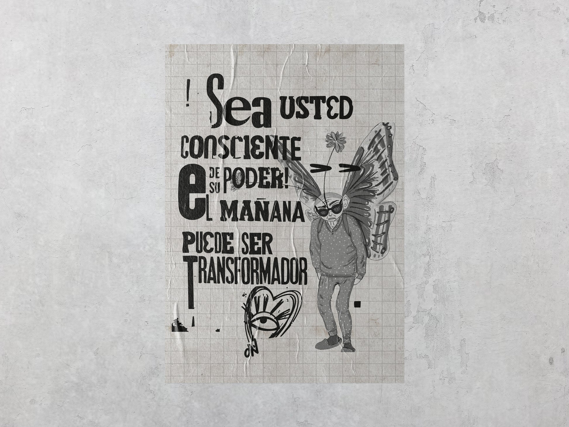 This artwork recreates the nostalgic feel of street flyers with a surreal twist: a hybrid “Butterfly Man” character in vintage clothing, oversized wings, and bold typography delivering a poetic message in Spanish: “Sea usted consciente de su poder. El mañana puede ser transformador” (“Be aware of your power. Tomorrow can be transformative”). The distressed background and hand-drawn kitsch elements evoke the look of old pasted city posters.