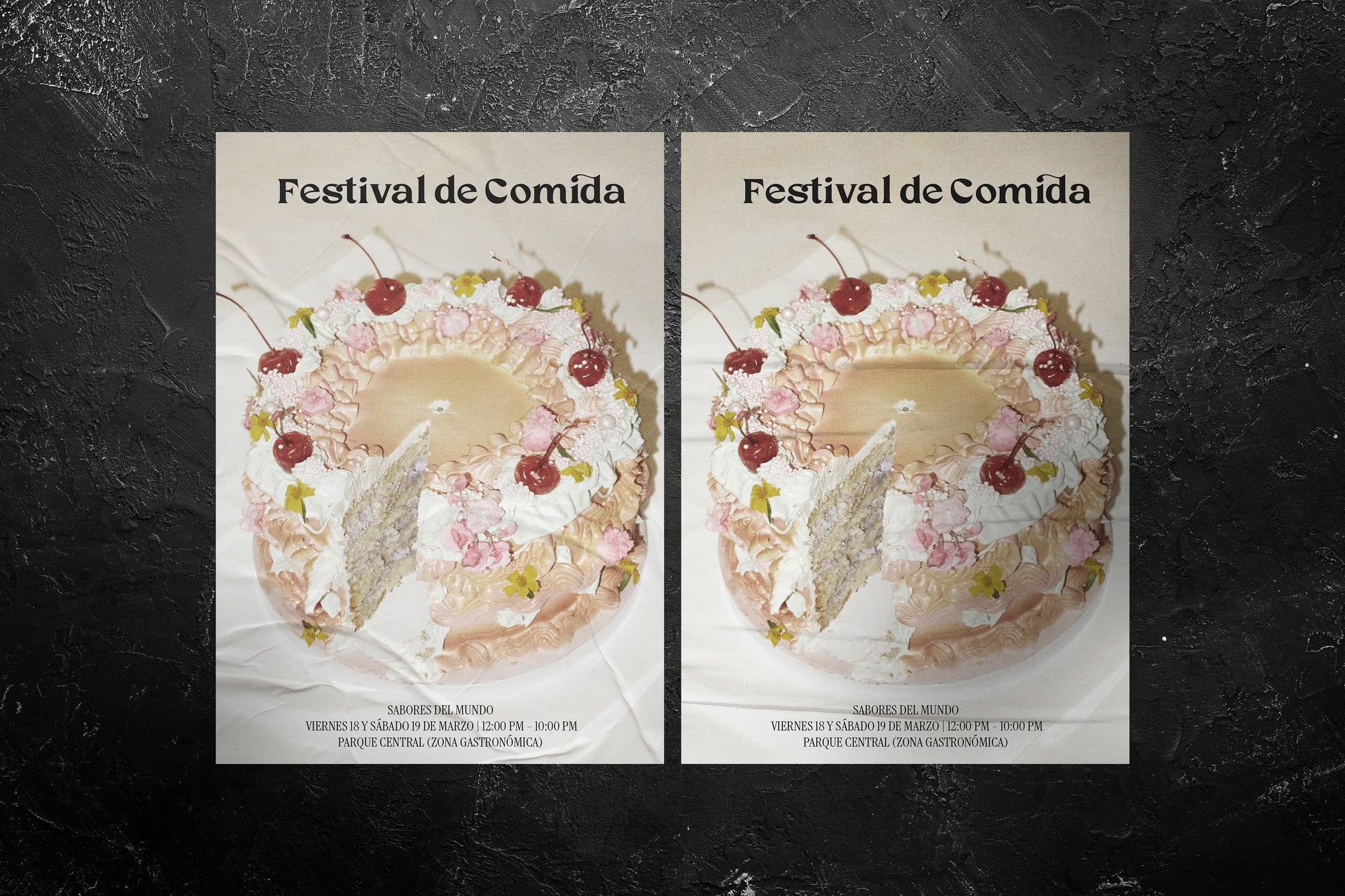 This delightfully kitsch poster features a vintage photograph of an ornate pastel cake topped with cherries and piped flowers, advertising a fictional food festival. Its minimal layout and nostalgic styling echo 80s and 90s event flyers often found in bakeries, party supply shops, or taped to street posts. The soft lighting and romantic food styling make this piece perfect for stylized sets or quirky home décor.