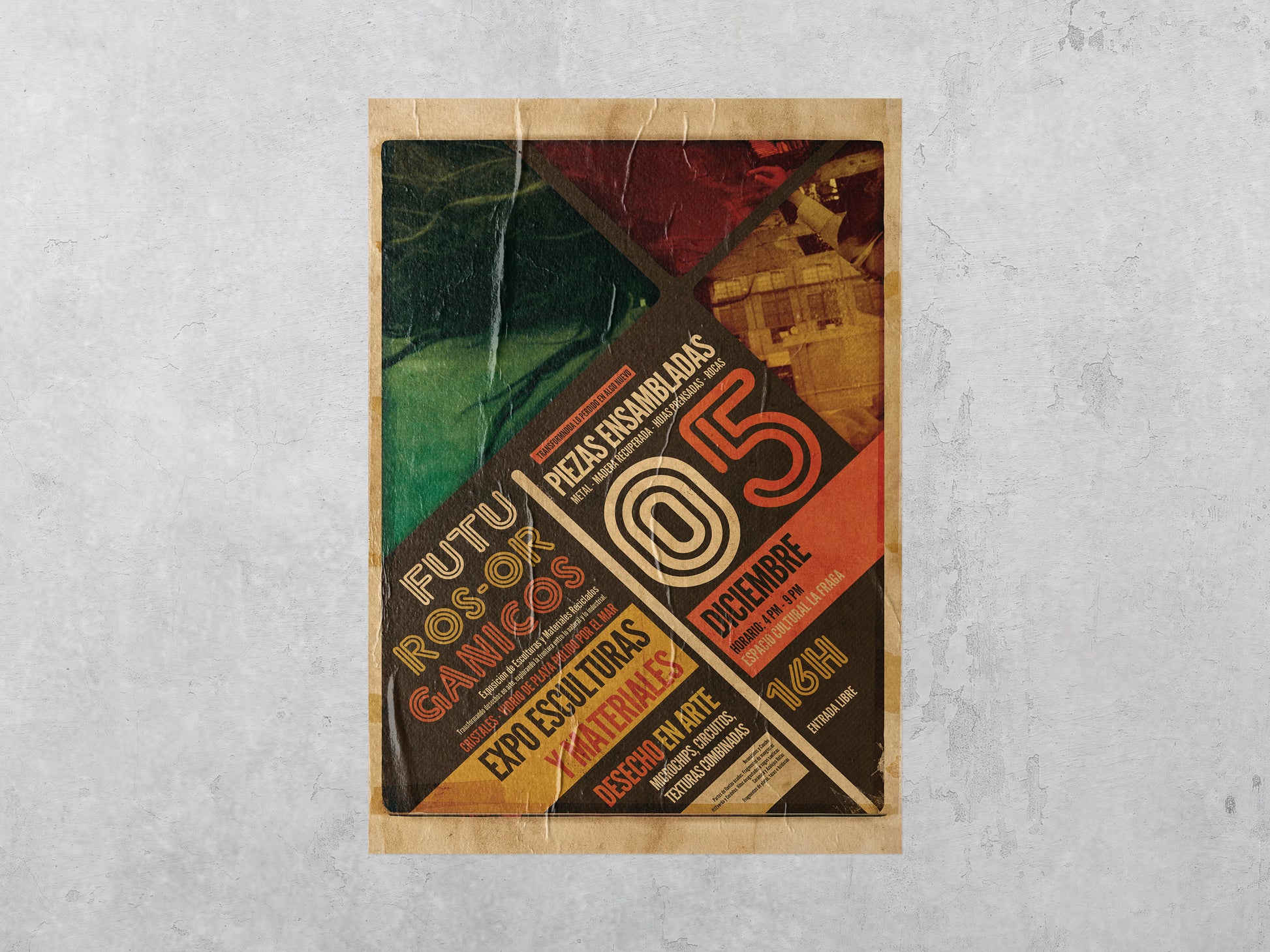 This design mimics a vintage flyer for a fictional sculpture and materials expo titled "Futuros Orgánicos" (Organic Futures), with graphic elements typical of 70s-80s Latin American print design. It features bold geometric layouts, vintage typography, and a worn-out paper texture to give it a truly aged, analog feel. The poster references fictional events like “Piezas Ensambladas” and “Desecho en Arte”, adding authenticity and a touch of surreal academic kitsch.