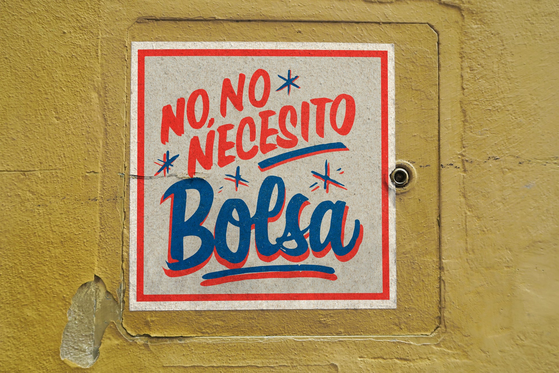 This colorful piece humorously recreates the look of hand-painted Mexican signage with a message that’s both sassy and socially conscious: “No, no necesito bolsa” (“No, I don’t need a bag”). Rendered in expressive red and blue script with a textured kraft paper background and vintage-style stars, this artwork captures the essence of urban eco-kitsch. Its large scale and square format make it ideal for use in sets, shop displays, or statement décor.