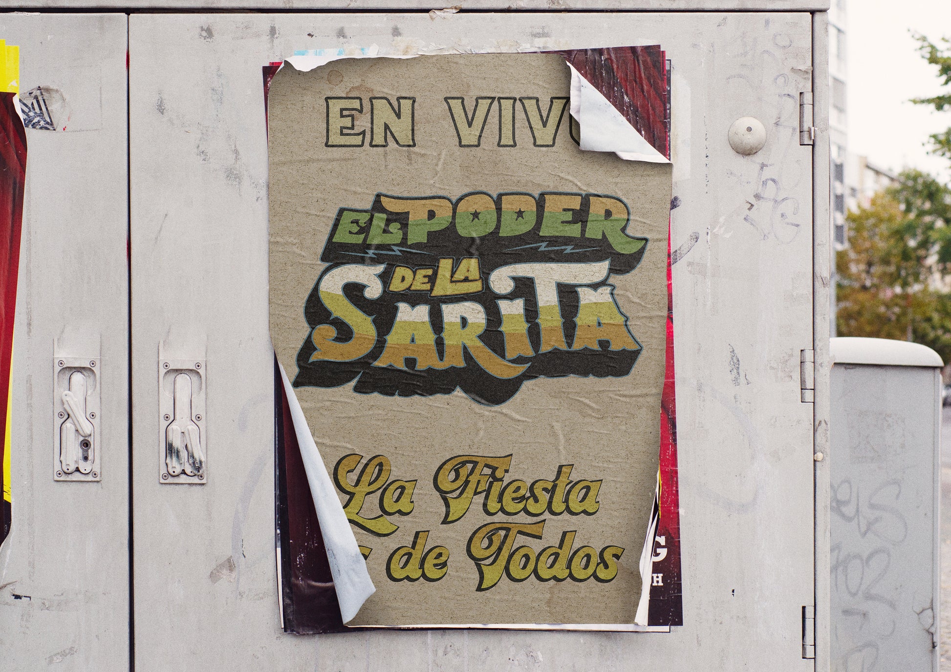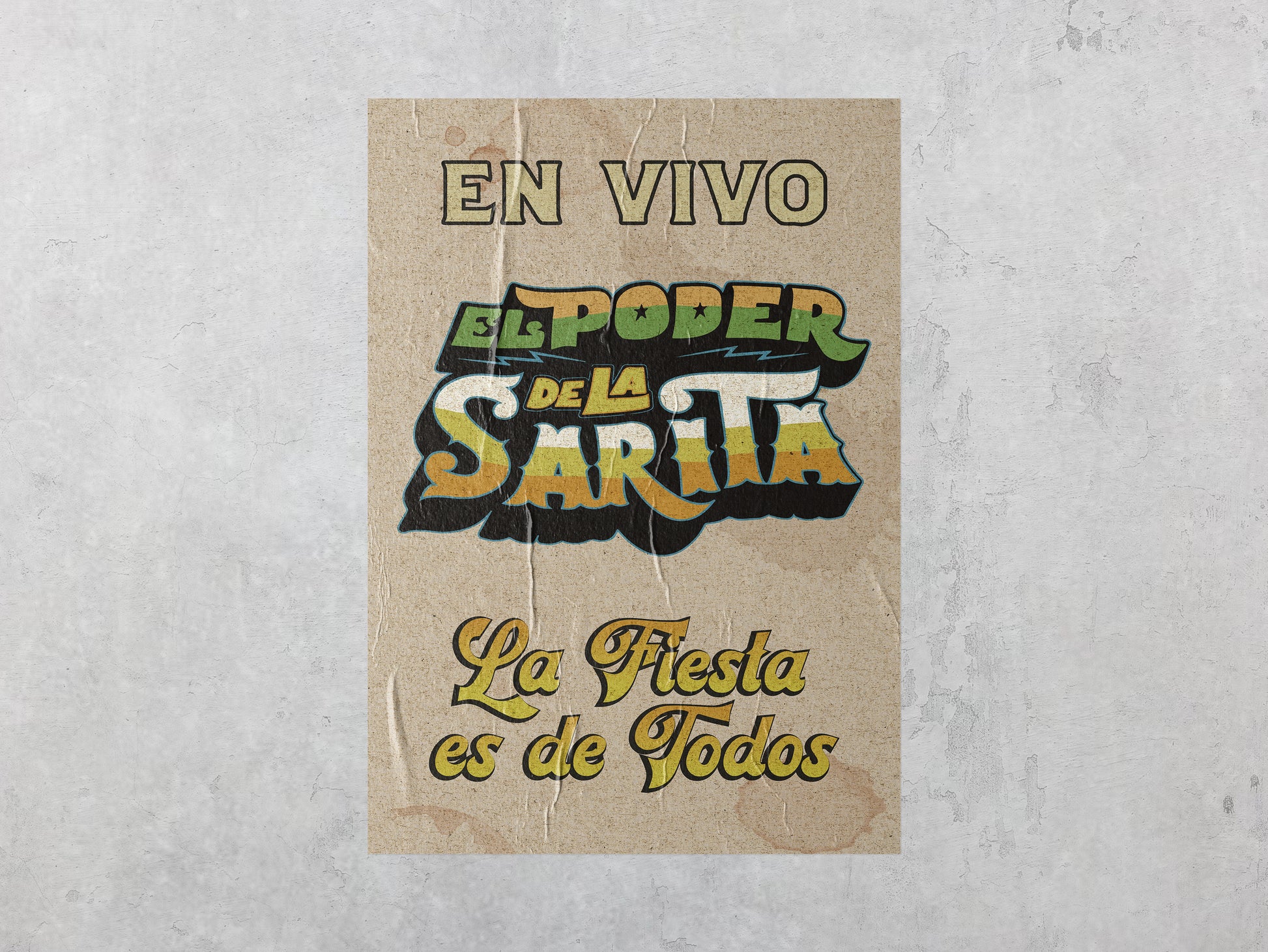 This playful poster features bold vintage typography announcing a fictional live music event: "El Poder de la Sarita – La Fiesta es de Todos." With its distressed paper texture, nostalgic layout, and saturated gradient colors, it feels like a real street flyer from the golden age of urban sound systems and neighborhood parties.