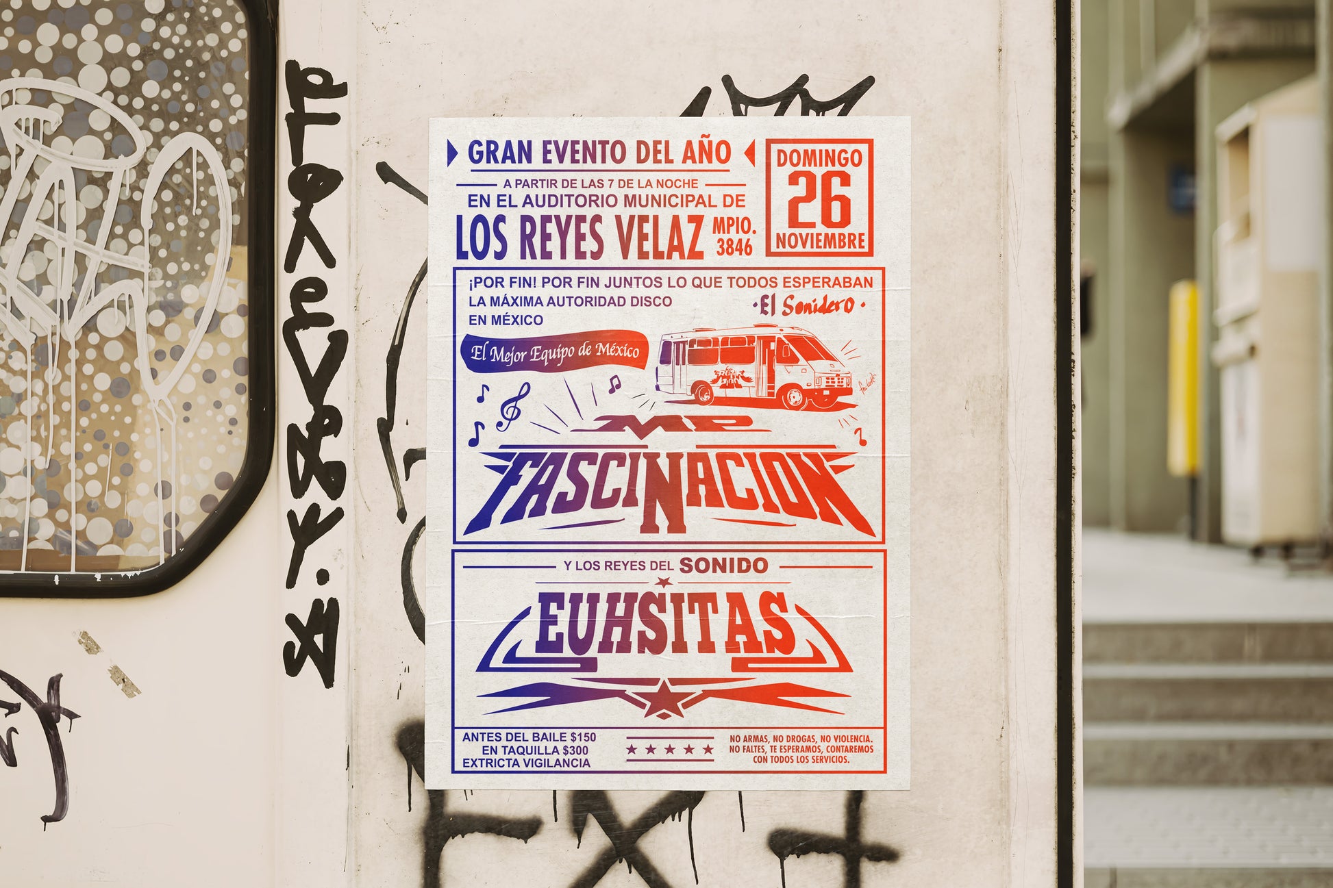 This vibrant print recreates a classic sonidero event flyer, complete with exaggerated typography, duotone gradients, and an illustrated bus decked out with speakers. Featuring fictional sound systems like MP Fascinación and Euhsitas, it announces a “Gran Evento del Año” in the iconic style of 80s–90s street posters seen across Mexico.