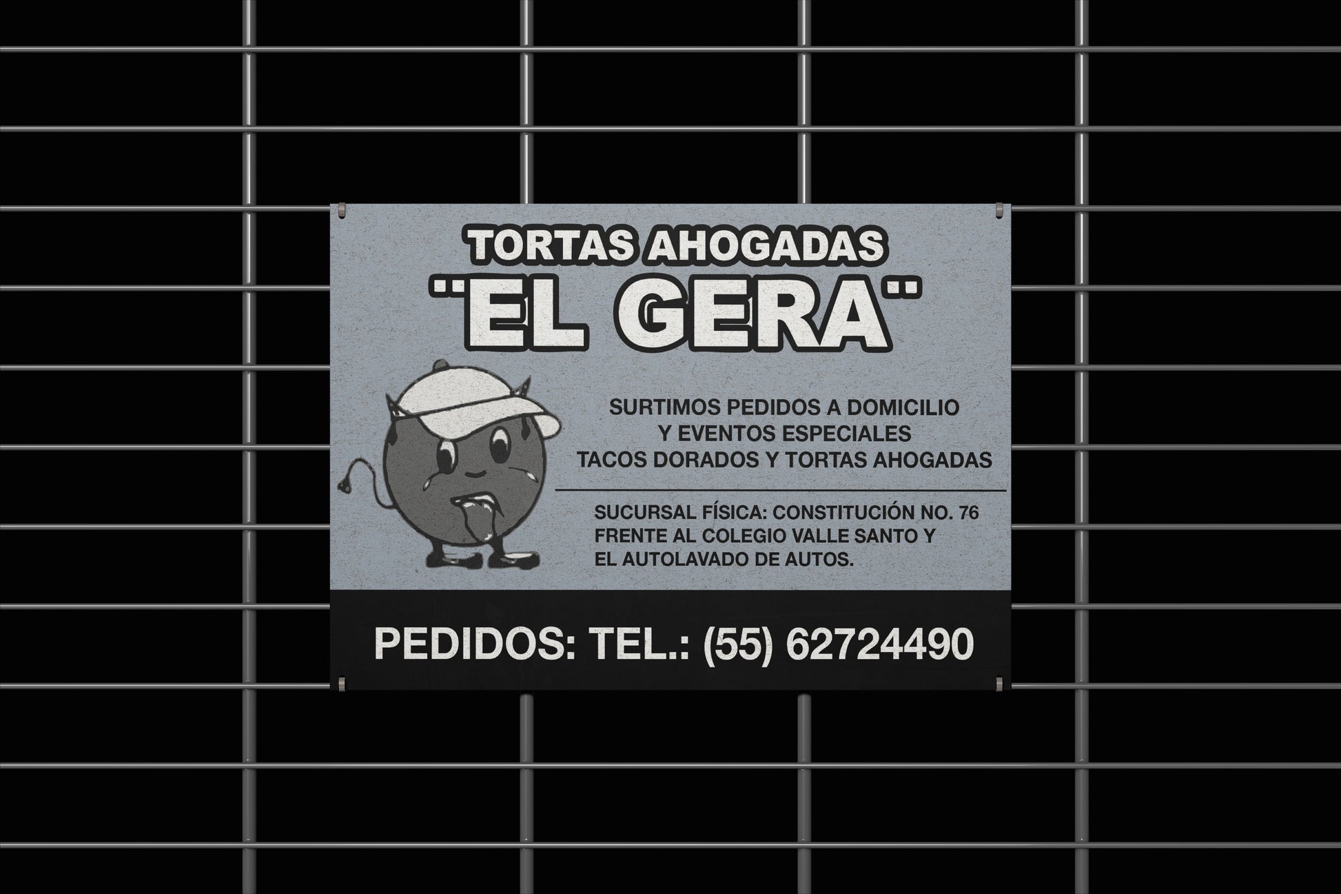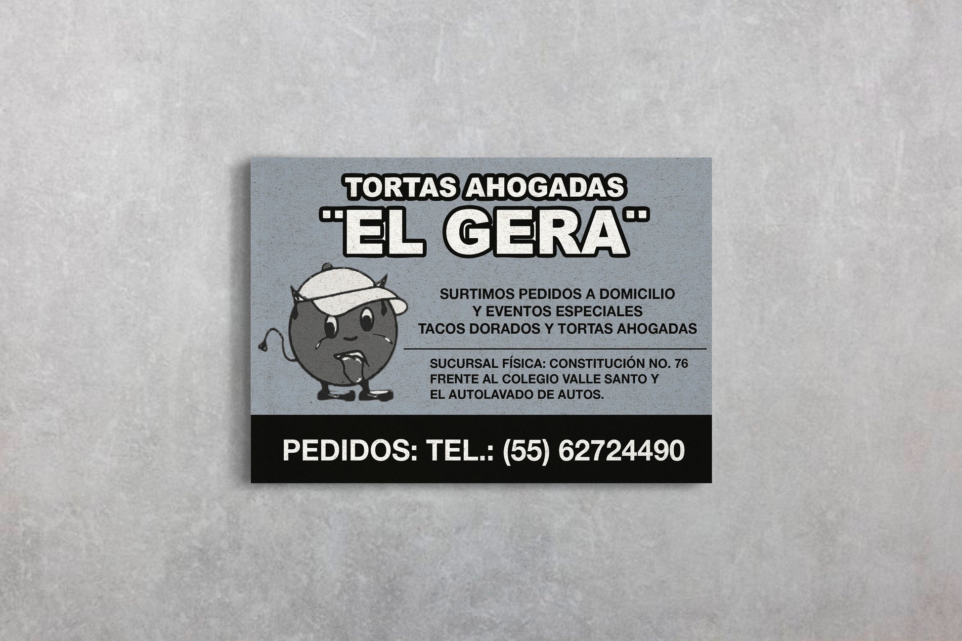 This gritty and nostalgic food business flyer features a bold street-style layout promoting “Tortas Ahogadas El Gera,” a fictional spot offering tacos and tortas for home delivery and events. Complete with a cartoon mascot, vintage typography, and local references, the design authentically mirrors real-life posters found on walls across Mexican neighborhoods.