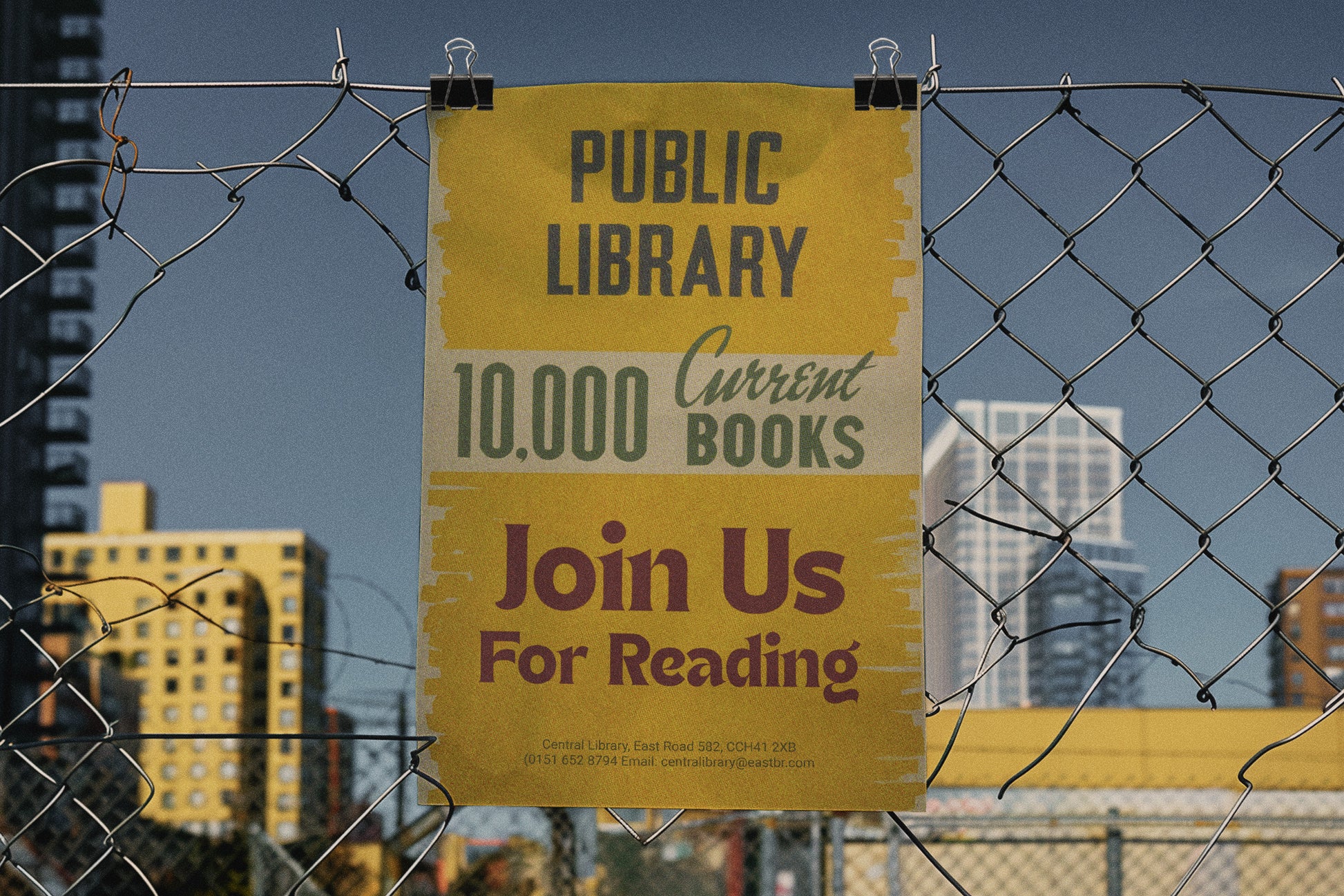 This artwork mimics an old-school public announcement poster, featuring distressed textures, bold serif fonts, and a warm color palette of mustard yellow and deep red. Promoting a fictional library with “10,000 current books,” the piece captures the charm of mid-century community posters with its earnest message: “Join Us For Reading.”