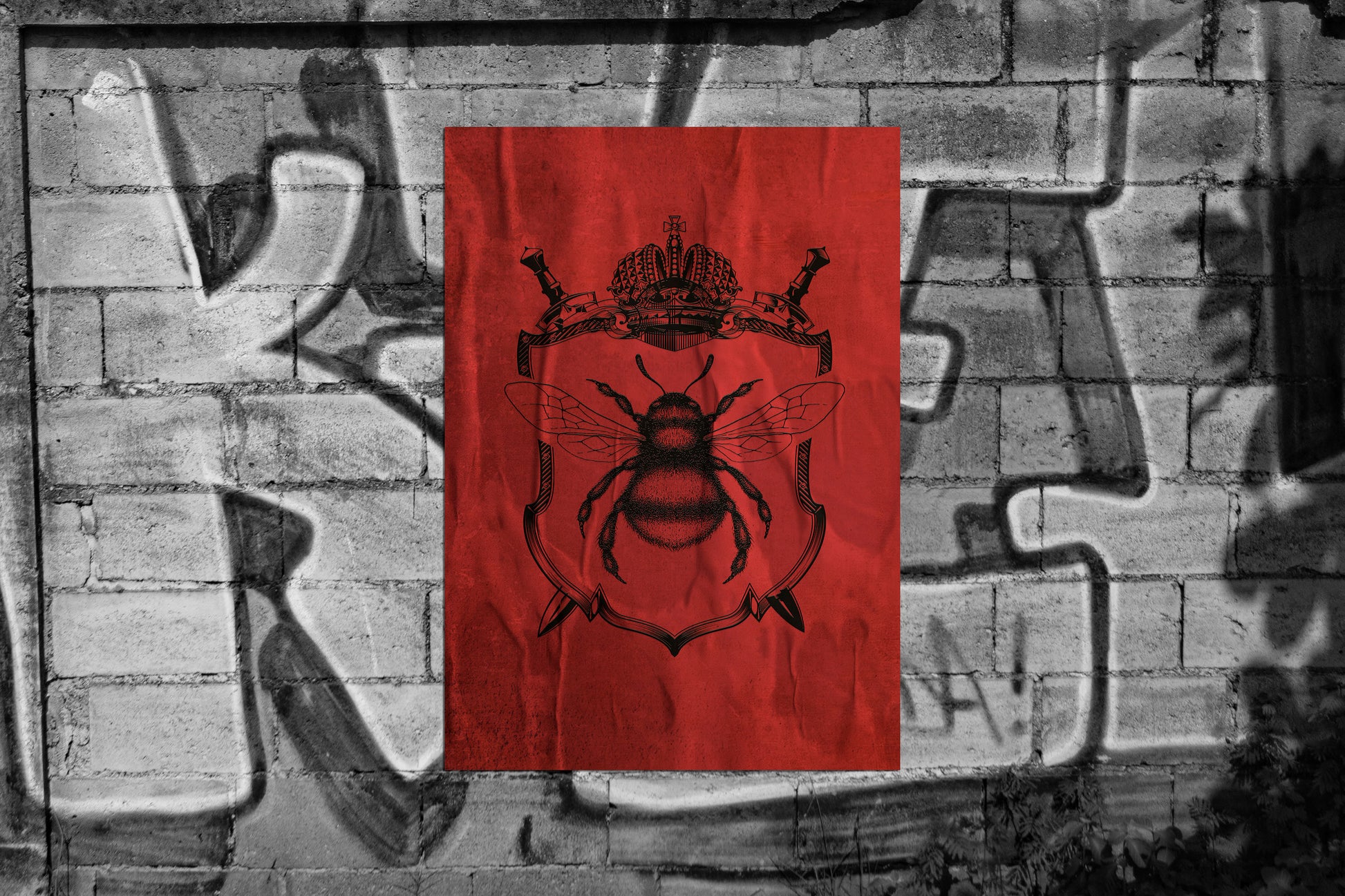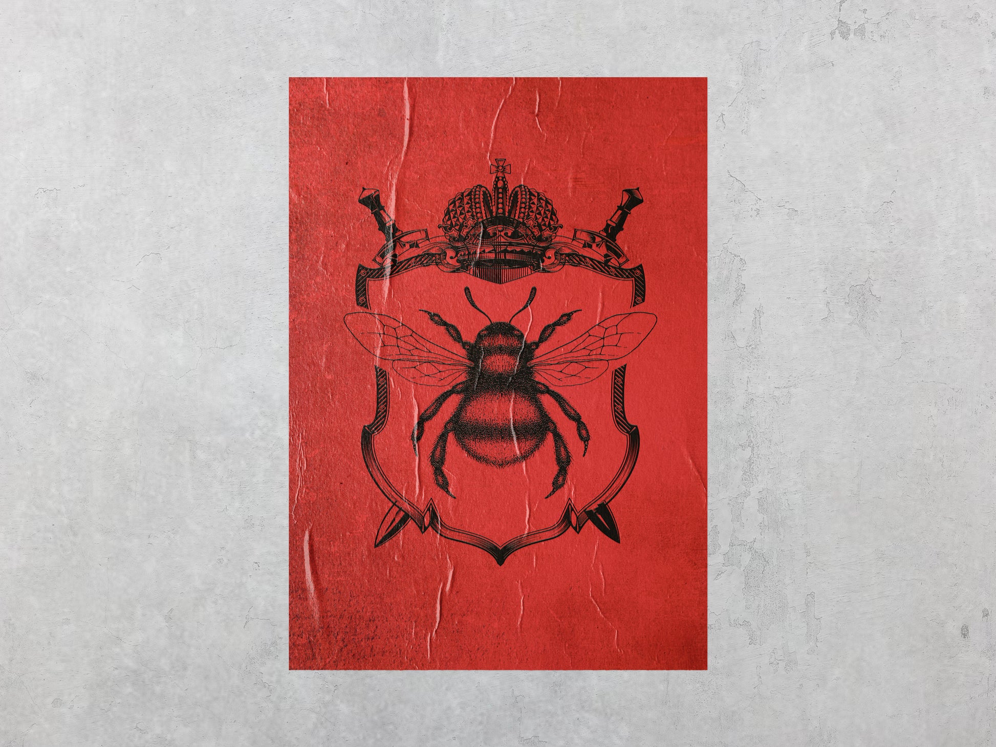 This artwork features a highly detailed black illustration of a bee centered within an ornate coat-of-arms frame, topped with a crown and crossed swords. Set against a distressed red background, the piece evokes themes of power, hierarchy, loyalty, and rebellion. Its worn paper texture and minimal color palette give it the feel of an underground political poster or secret society emblem found in an urban environment.