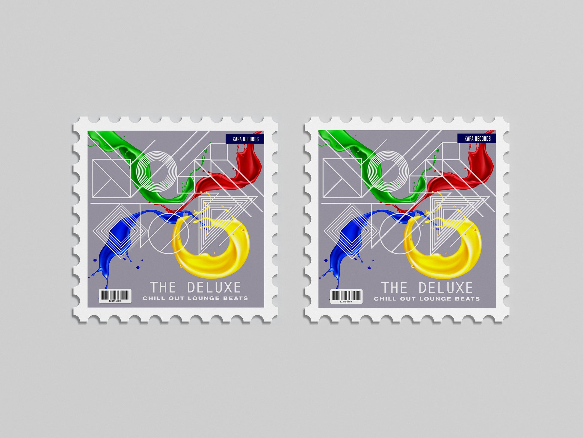 “The Deluxe Lounge Beats” is a primary color sleek, modern design that blends geometric minimalism with splashes of vibrant color. Bold strokes of green, red, blue, and yellow paint swirl across a clean grey background, while sharp white linework overlays create a sense of rhythm and balance. The overall composition evokes the relaxing yet stylish atmosphere of lounge music and chill-out beats.
