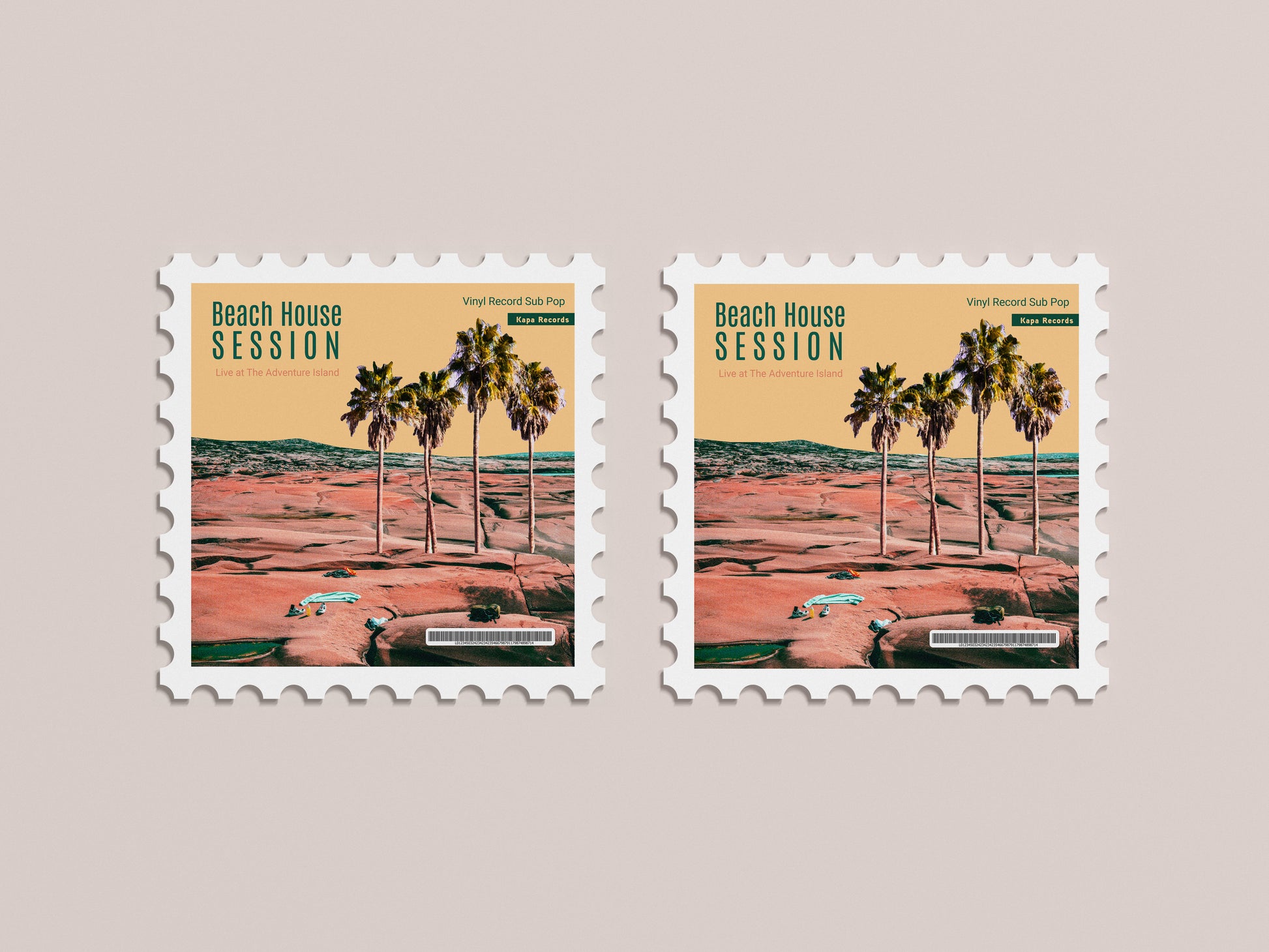 “Beach House Session” is a dreamy retro-inspired design featuring a surreal coastal collage: warm desert-like textures blended with teal ocean tones, accented by tall palm trees under a pastel sky. The bold vintage typography evokes the aesthetics of indie vinyl records, perfectly balancing music, nostalgia, and tropical vibes.