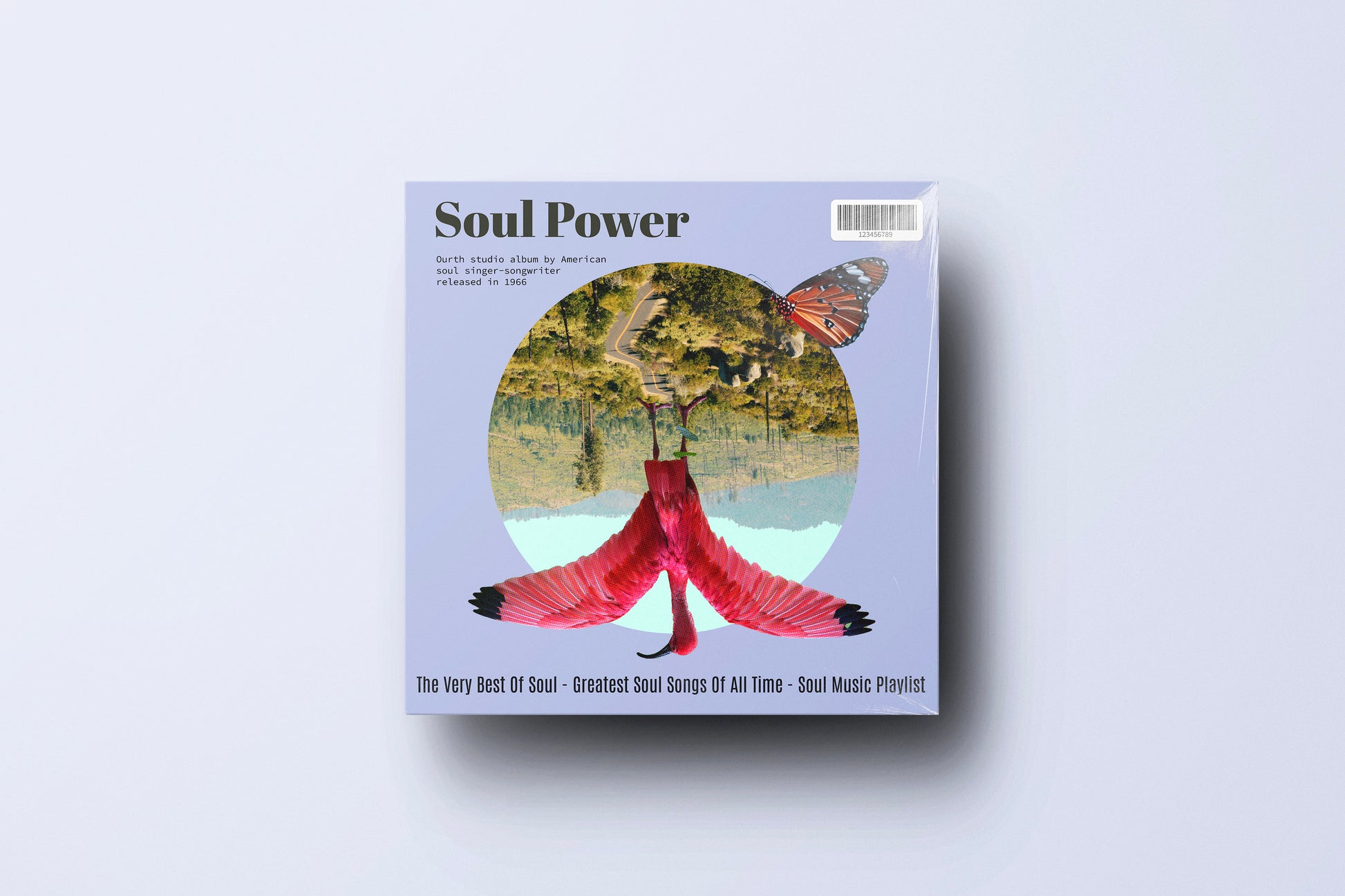 “Soul Power” is a bold retro-inspired design featuring a surreal collage: a bright scarlet flamingo flying against an upside-down landscape, accented with a butterfly and geometric framing. The nostalgic typography evokes vintage soul album aesthetics, while the composition balances nature, music, and graphic play.