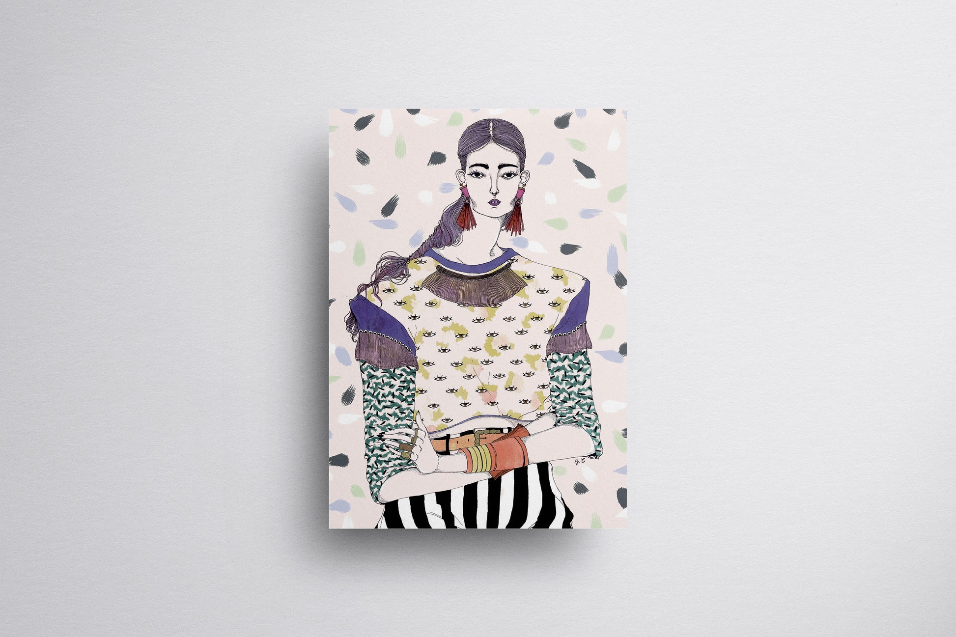 This artwork features a confident woman dressed in a mesmerizing mix of textures and prints: watchful eyes, leaf-like patterns, and striking black-and-white stripes. Her stoic expression, oversized red tassel earrings, and geometric accessories add a strong character to the piece. Set against a pastel background with painterly strokes, the image balances elegance, chaos, and contemporary edge.