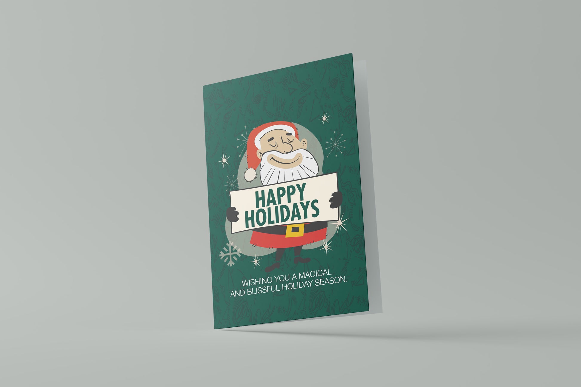 This joyful Christmas illustration features a charming cartoon Santa Claus holding a large sign that reads "Happy Holidays," surrounded by delicate snowflakes and starbursts on a deep green background. With a big smile and warm expression, Santa spreads cheer and comfort, while the message below reads: “Wishing you a magical and blissful holiday season.”