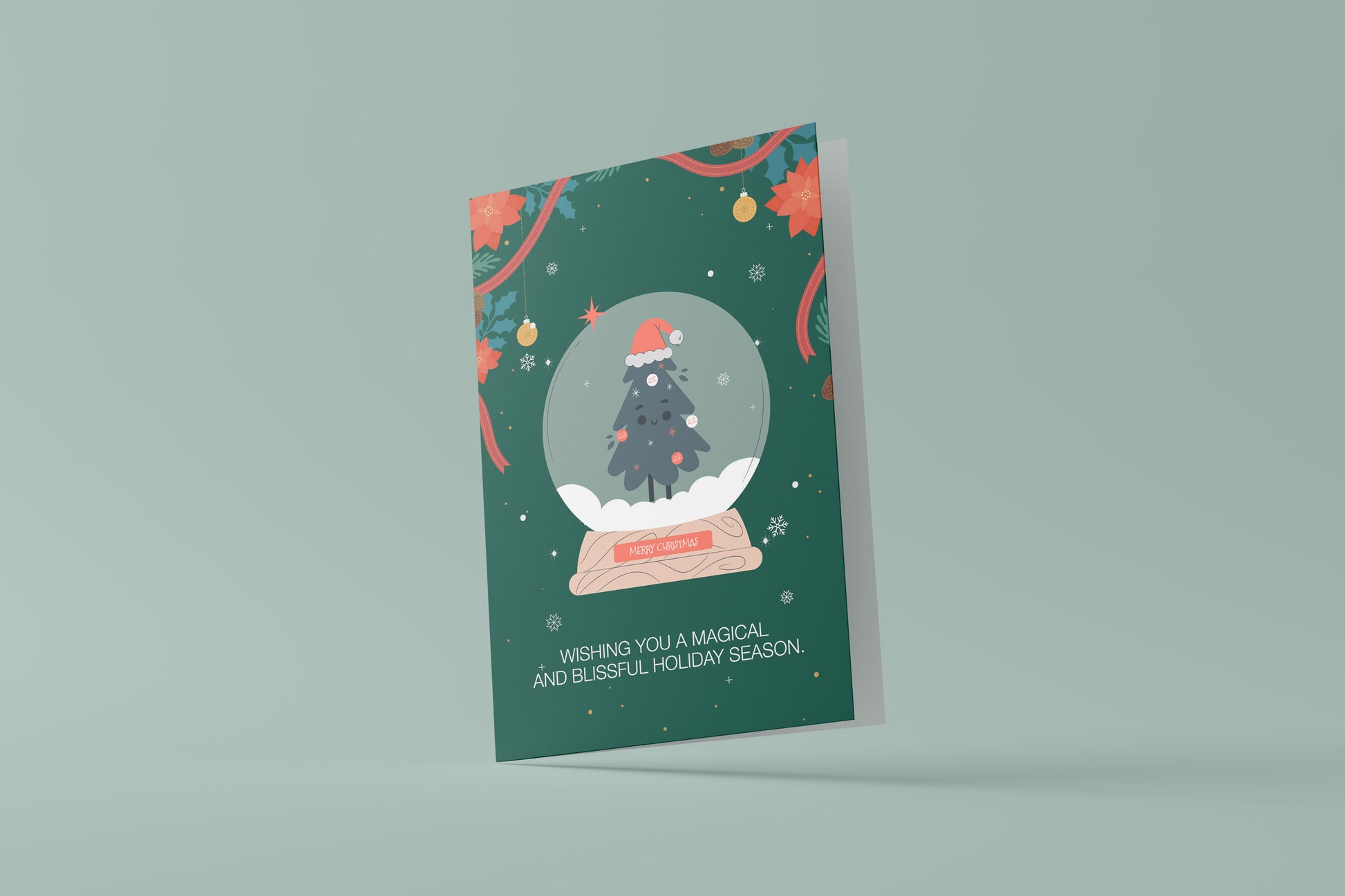 This festive illustration features a cheerful Christmas tree inside a snow globe, wearing a Santa hat and decorated with ornaments. Surrounded by poinsettias, golden baubles, and red ribbons, it creates a cozy holiday atmosphere full of warmth and joy. The deep green background is sprinkled with snowflakes and sparkling stars, enhancing its magical Christmas charm.