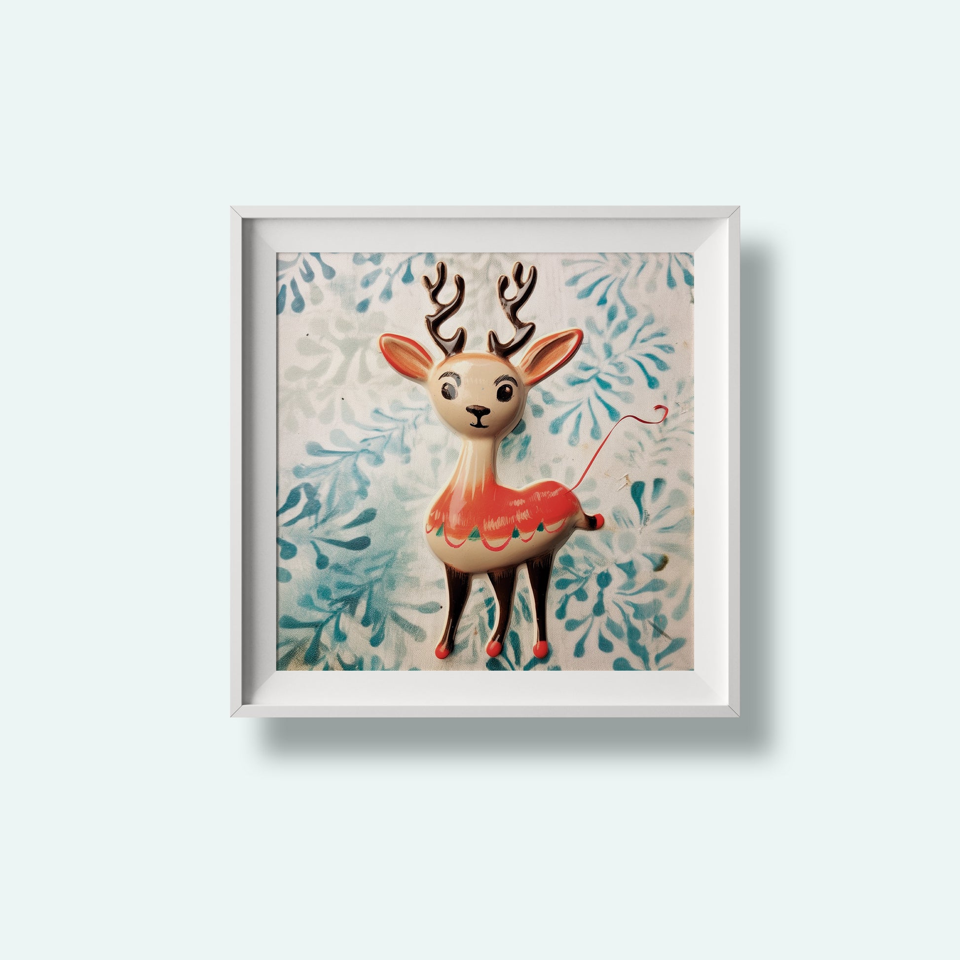 This is a sweet and stylized holiday illustration inspired by mid-century ceramic ornaments. This whimsical reindeer features a high-gloss porcelain look with a cream body, coral-red saddle pattern, and delicate antlers painted in soft brown. Its expression is innocent and playful, and it stands against a textured backdrop of vintage teal mistletoe patterns, evoking the cozy charm of classic holiday textiles.