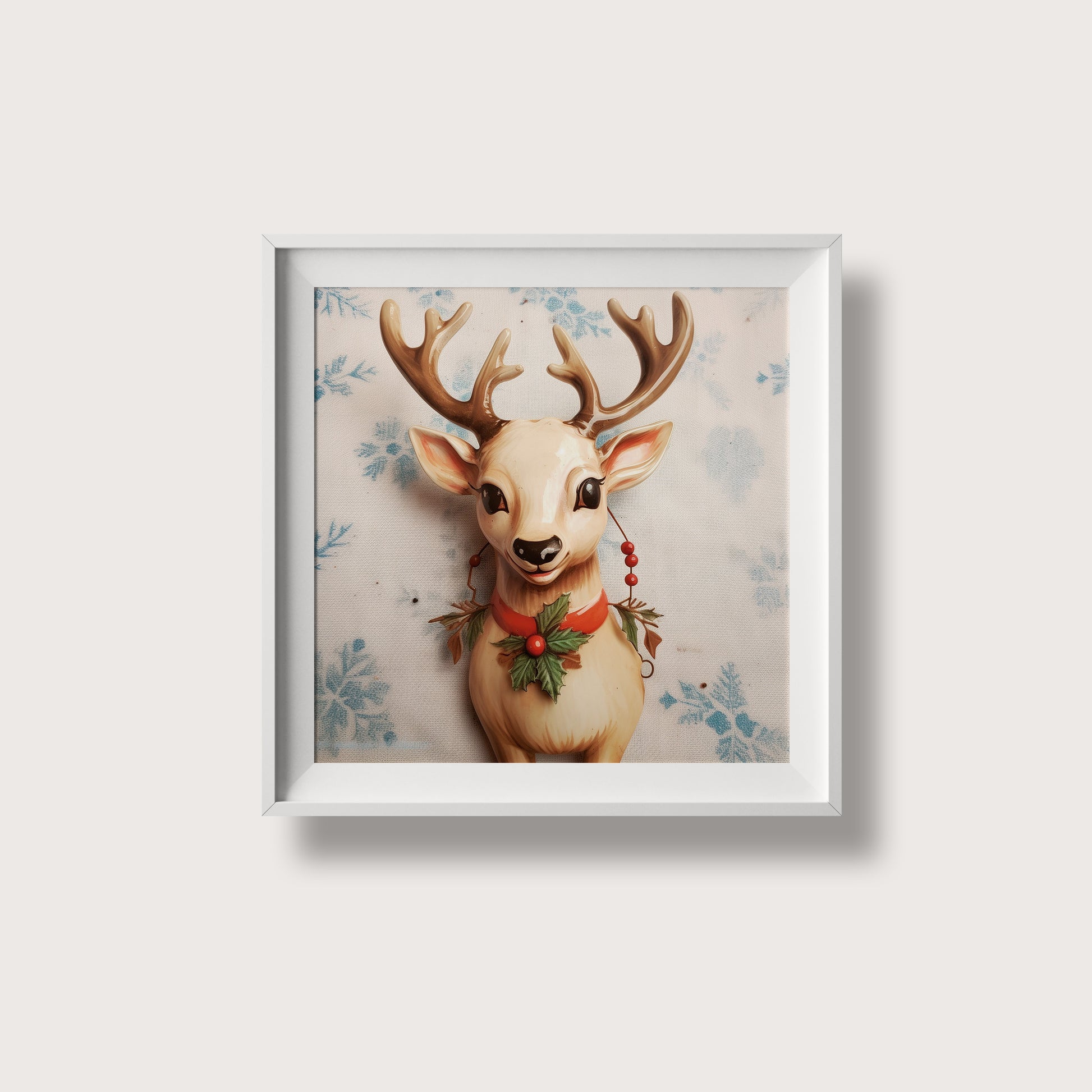 This is a nostalgic Christmas-themed illustration capturing the charm of classic mid-century holiday decor. The artwork features a sweet porcelain-style reindeer bust with large expressive eyes, soft tan coloring, and gently curved antlers. Adorned with a red ribbon, holly leaves, and retro red bead ornaments hanging from its antlers, the reindeer appears to smile warmly against a soft snowy backdrop of blue stenciled snowflakes.