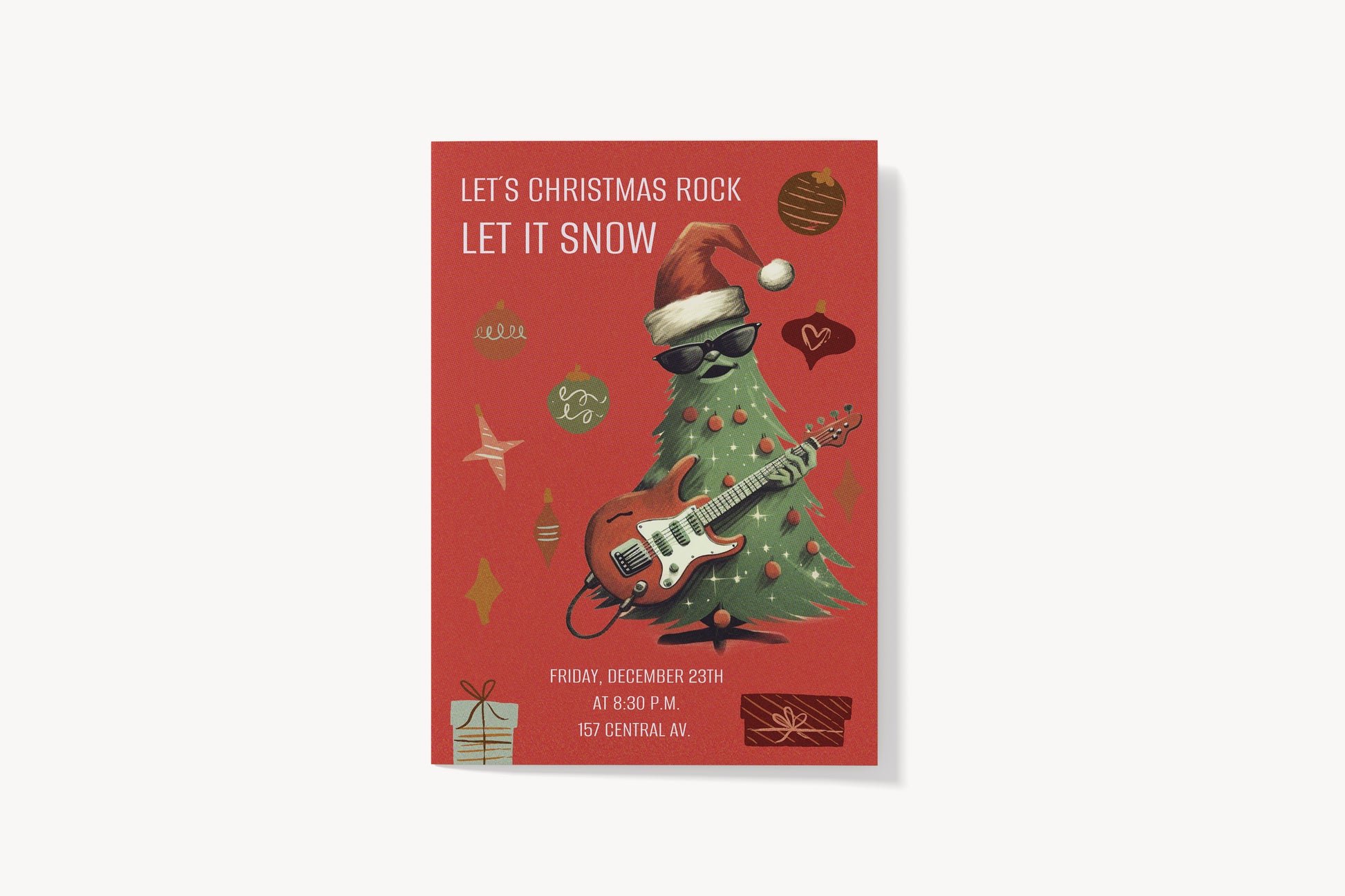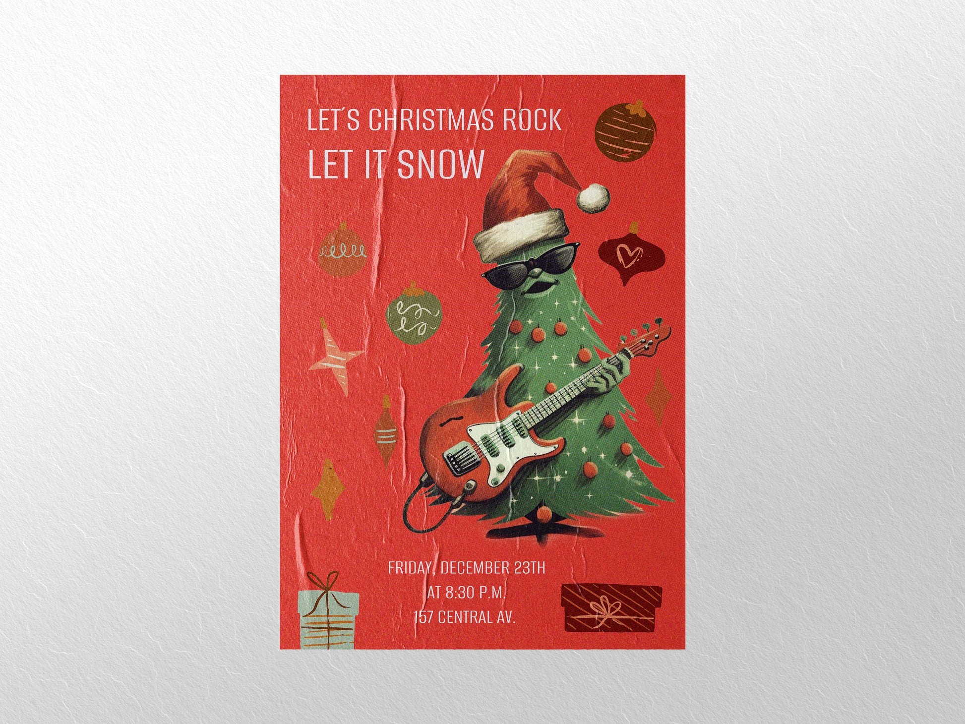 This bold and playful Christmas poster features a cool Christmas tree rocking an electric guitar, complete with a Santa hat and sunglasses. Surrounded by floating ornaments, stars, and wrapped gifts, the vibrant red background and dynamic composition create a festive and edgy holiday vibe. The text “LET’S CHRISTMAS ROCK” and “LET IT SNOW” give it the look of a fun, music-themed Christmas event flyer.