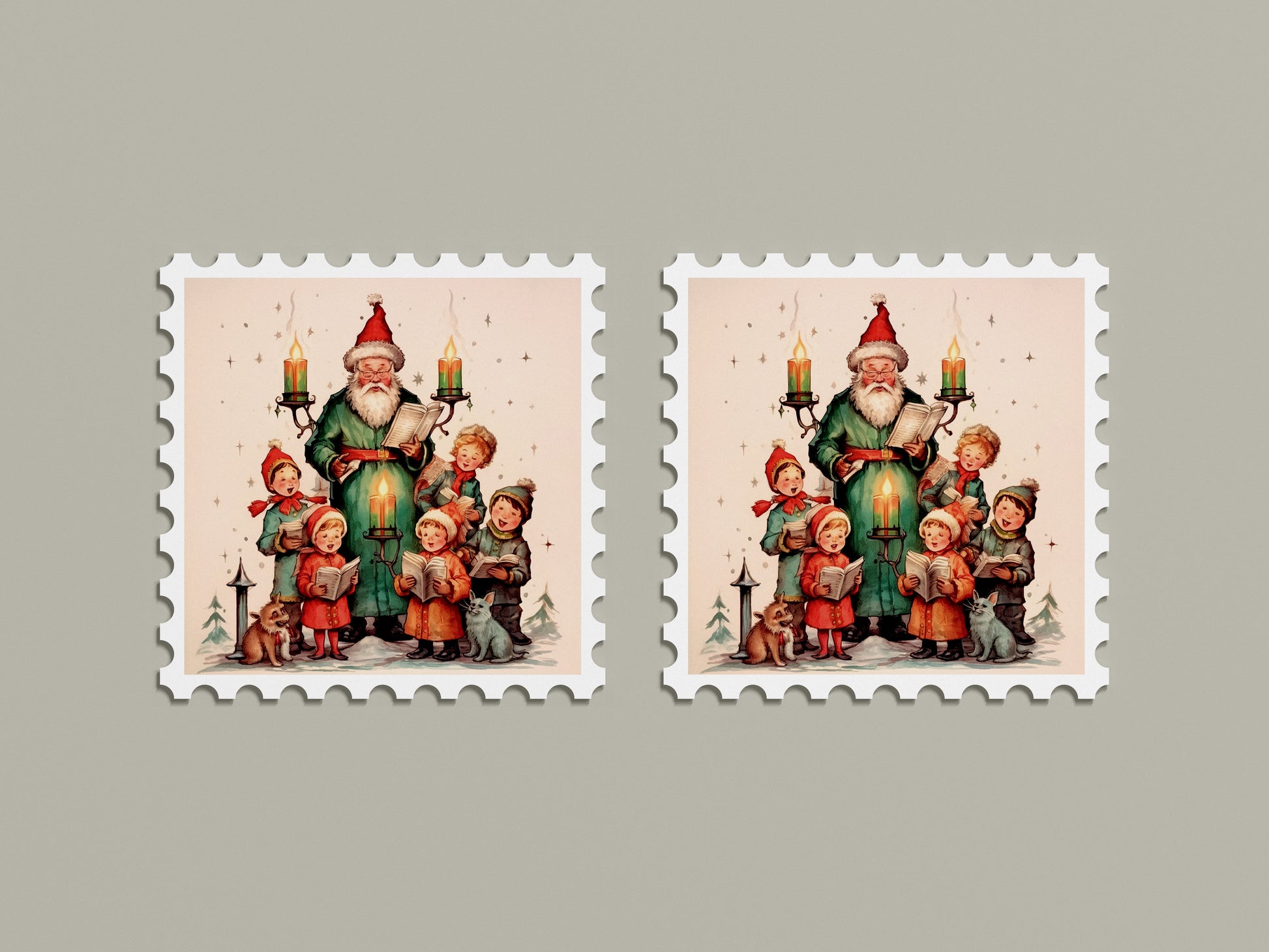 This artwork is a joyful and heartwarming illustration featuring Santa Claus in a green robe, surrounded by a group of singing children. Each child is dressed in bright, retro-style winter clothing, holding open songbooks as they sing cheerfully under the candlelight. Santa, smiling gently with his own book in hand, is framed by glowing candle sconces and twinkling stars in the snowy evening scene. A curious cat and a fluffy dog complete the idyllic winter gathering.