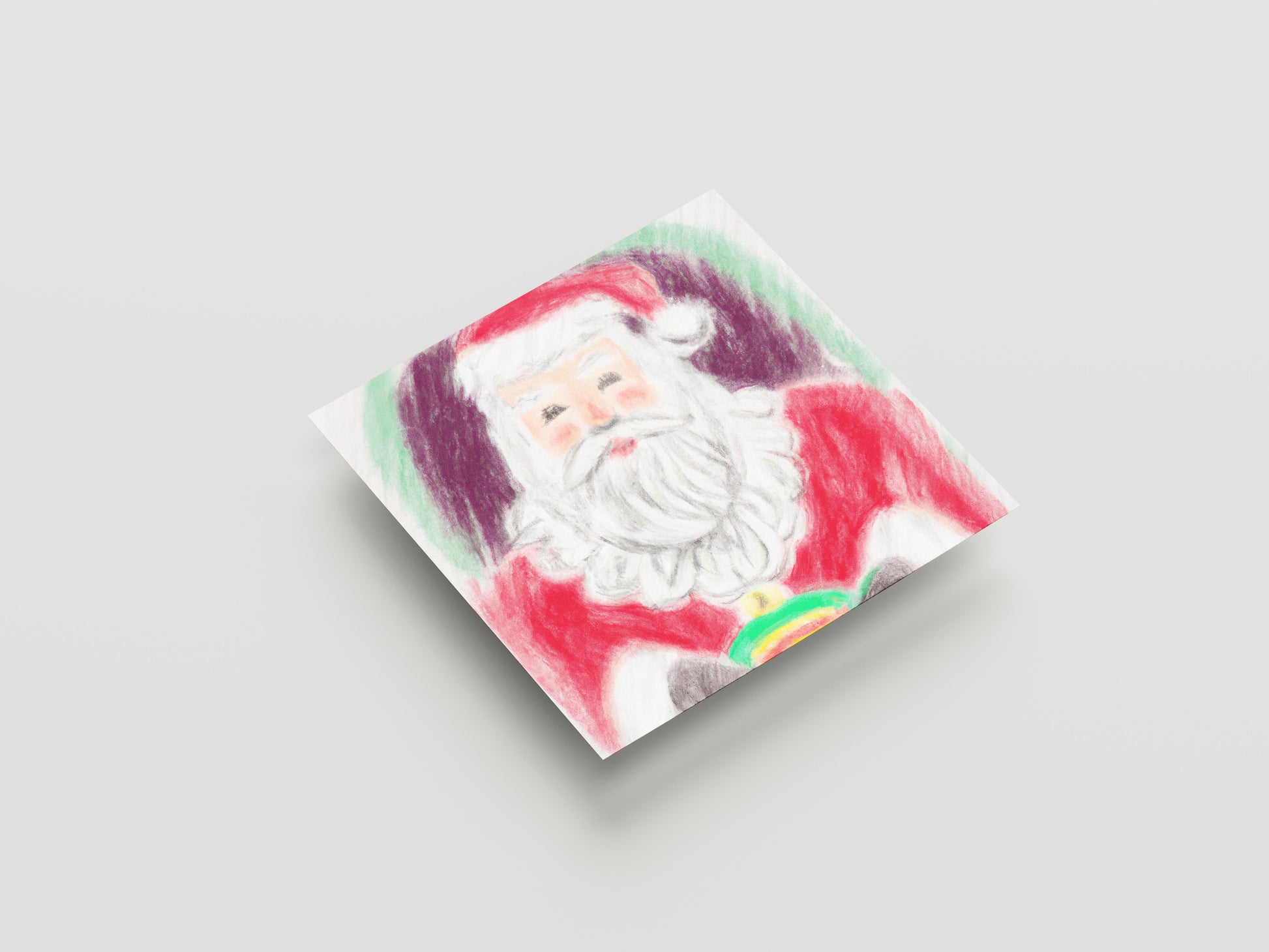 This charming Christmas piece features a jolly Santa with a glowing red suit and textured white beard, drawn in soft colored pencil strokes. Its naïve, childlike style and warm pastel tones evoke classic Christmas cards and school art projects, adding a playful retro touch to any setting.