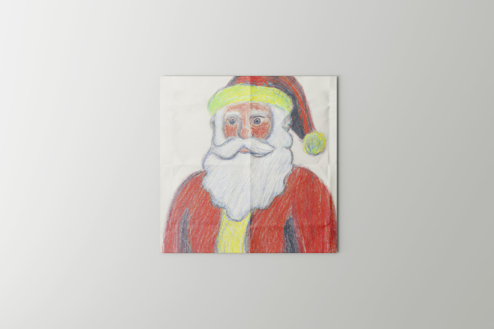 This festive artwork features a charming, childlike drawing of Santa Claus, created with colored pencils in vivid reds, whites, and neon greens. The expressive eyes and textured strokes give it a warm, nostalgic feel—like something out of a vintage holiday card or a retro Christmas ad. Ideal for sets needing a whimsical holiday touch or anyone looking to bring heartfelt, homespun vibes to their decor.