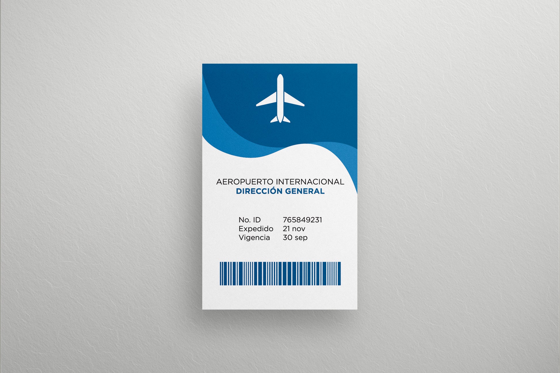 A clean, modern identification badge layout perfect for film or TV productions needing realistic airport credentials. This design features a bold airplane icon, curved graphic elements in layered blue tones, and a professional information section including ID number, issuance and expiration dates, plus a barcode for added authenticity. The layout mimics the look and structure of real airport staff badges while remaining entirely fictional and safe for production use.