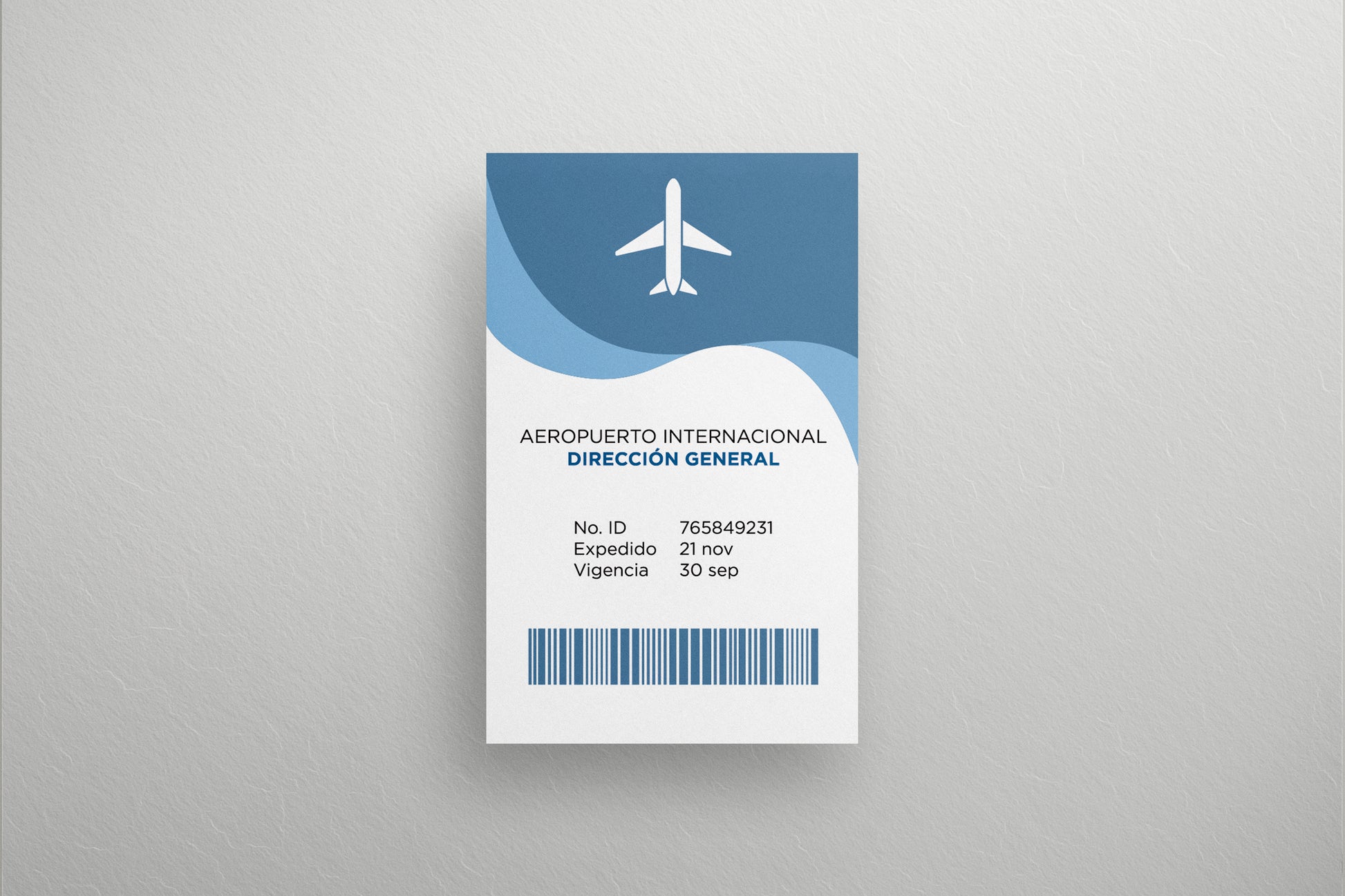 A sleek and modern identification badge layout ideal for film or TV productions requiring realistic airport credentials. This design features a clean airplane icon centered at the top, layered blue wave graphics, and a structured information section including ID number, issue date, expiration date, and a barcode for added authenticity. The overall look is professional, contemporary, and suitable for any aviation-themed environment.