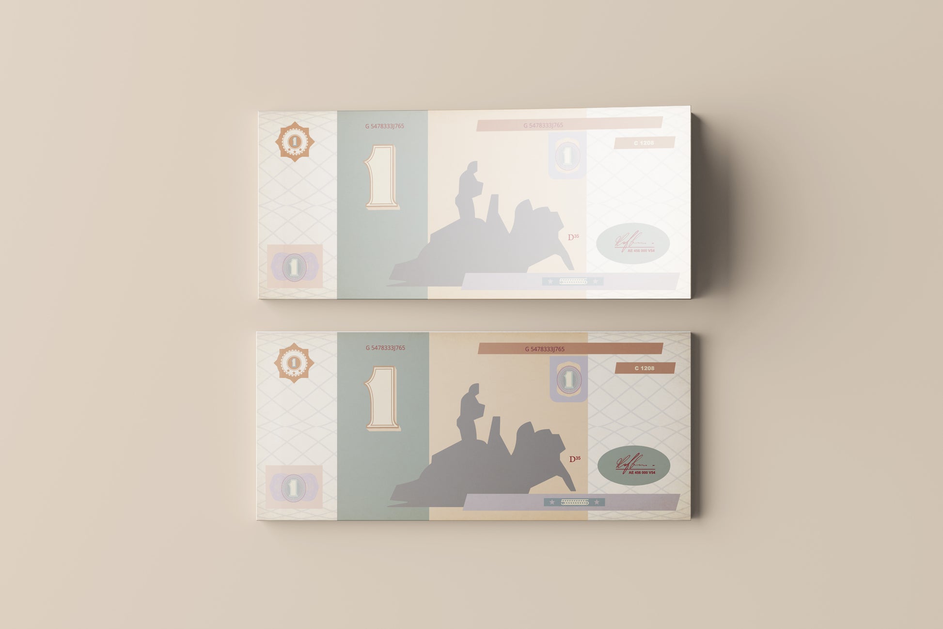 This stylized banknote design blends graphic minimalism with retro-futuristic detailing, evoking the feel of alternate currencies in imagined worlds. Its composition features a clean, geometric layout with vintage-inspired typography and a fictional silhouette monument at its center — all rendered in a soft, desaturated color palette reminiscent of mid-century design.