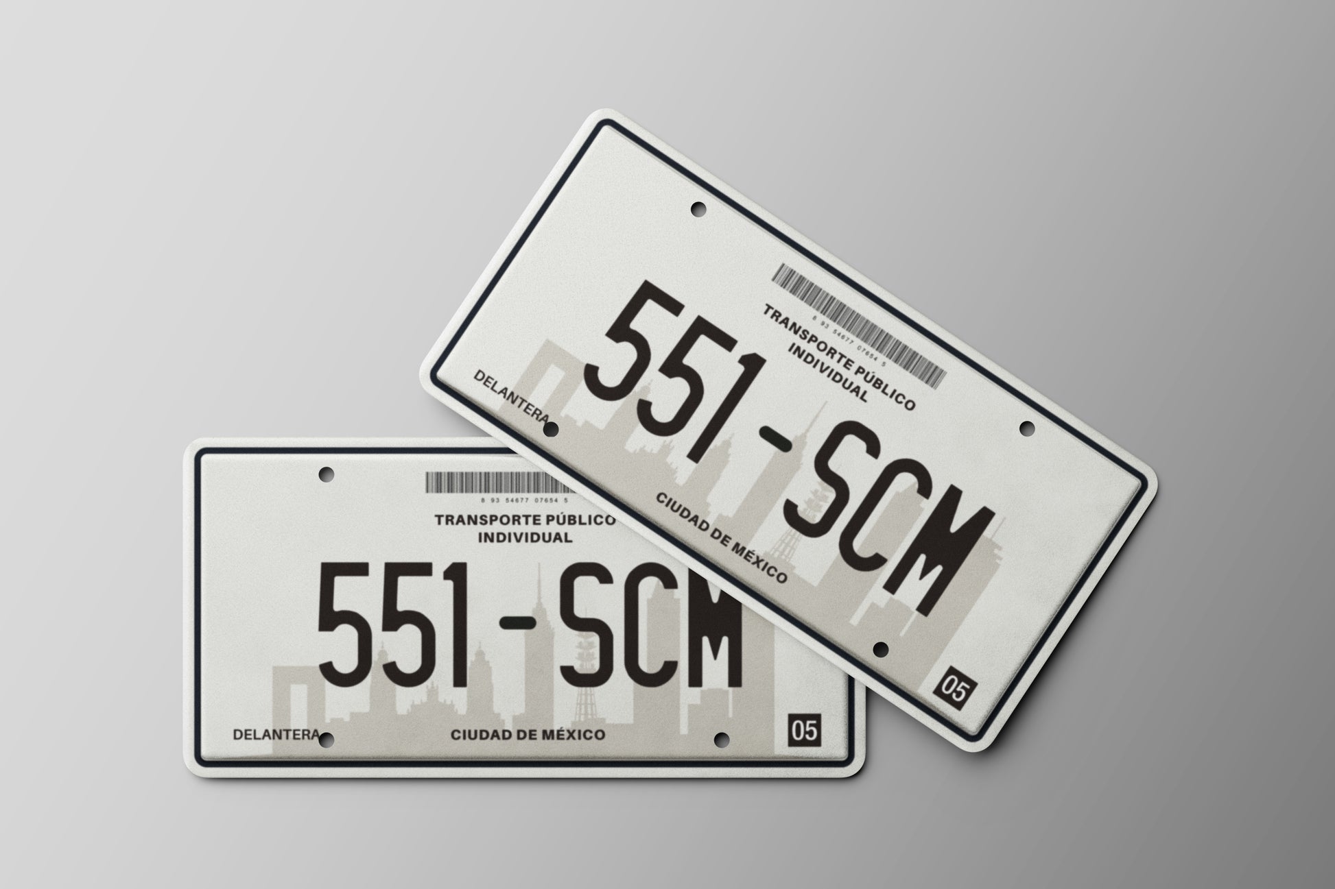 Authentic-style Mexico City taxi license plate prop design, ideal for film, photography, or décor. This print captures the minimalist aesthetic of modern Mexican transit plates, featuring the text “Transporte Público Individual” and a bold black serial number over a subtle beige background. The faint silhouette of the CDMX skyline, barcode, and small regulatory details complete its realistic look.