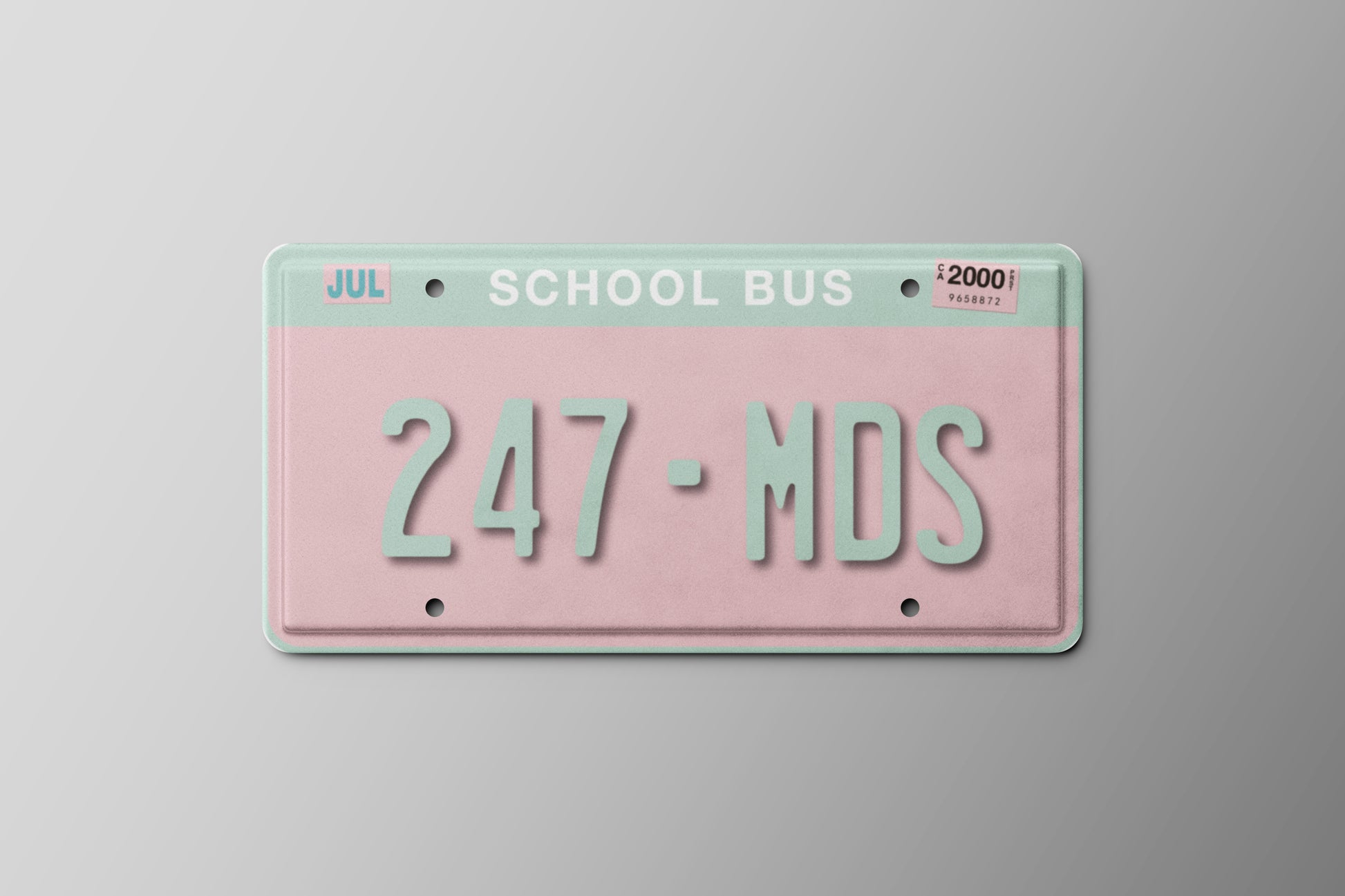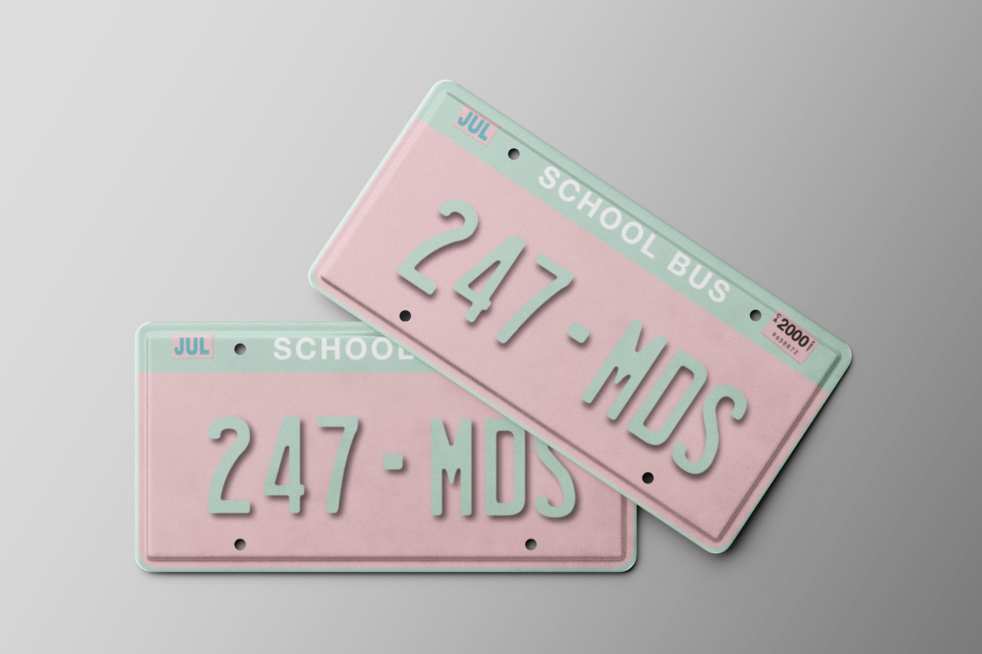Retro-inspired school bus license plate prop in soft pastel tones. This digital plate design features a mint-green frame and bold pink background with raised lettering that reads 247-MDS. Subtle wear and shadow details give it the look of a real embossed plate — perfect for adding a nostalgic yet playful touch to your set design, wall art, or digital mockups.