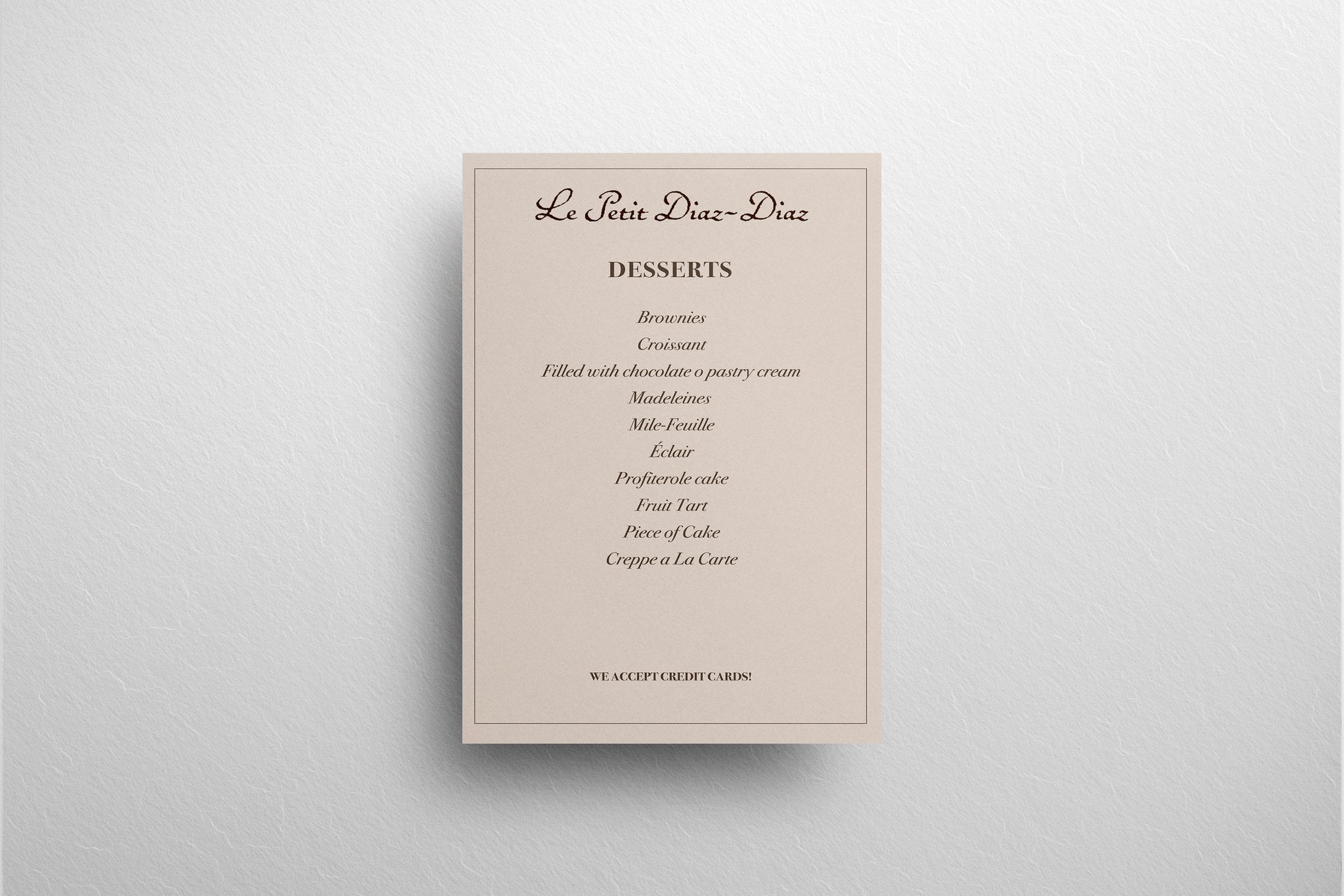 Refined French-style dessert menu design, perfect as a film/TV prop or elegant set decoration.