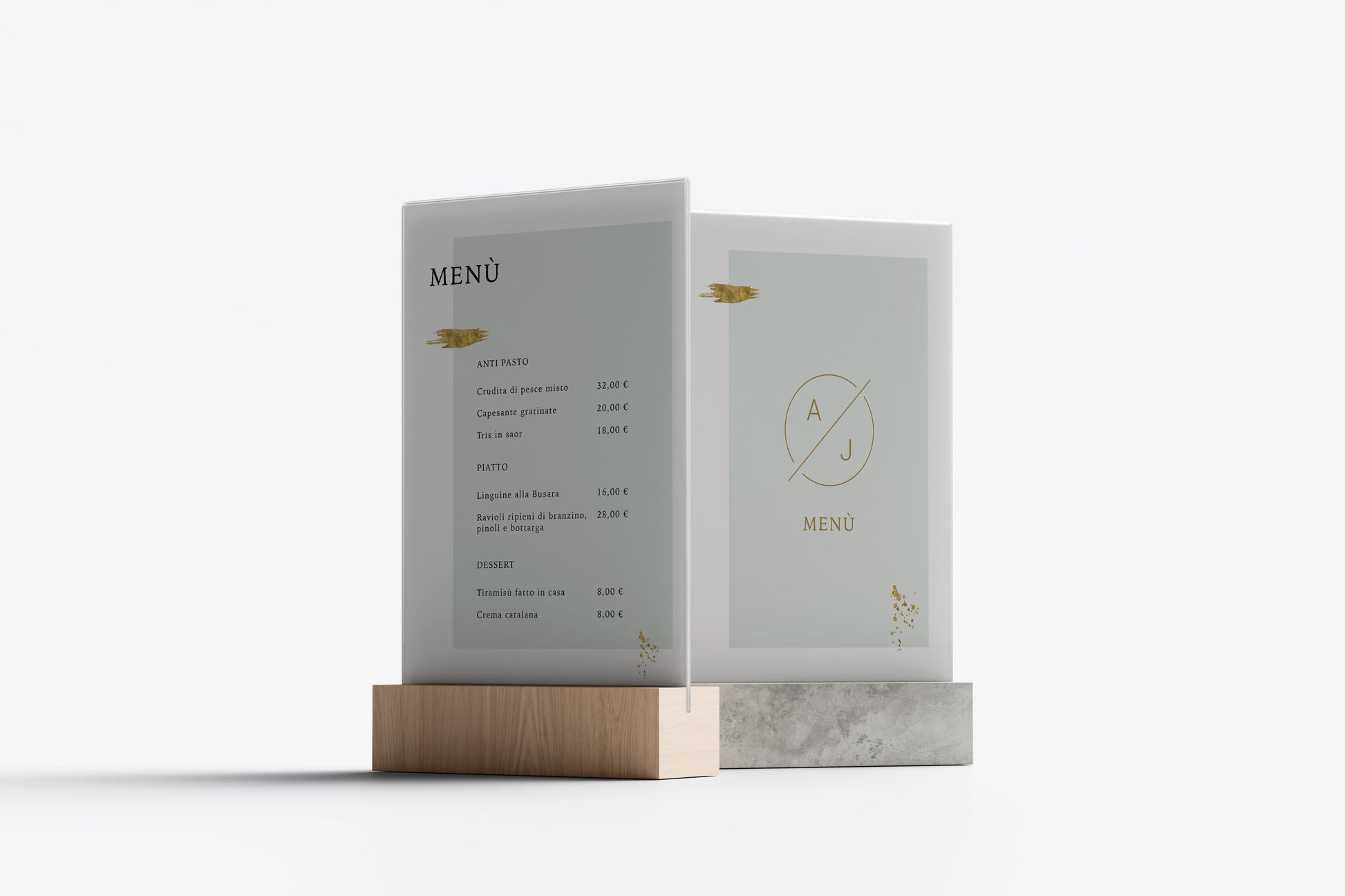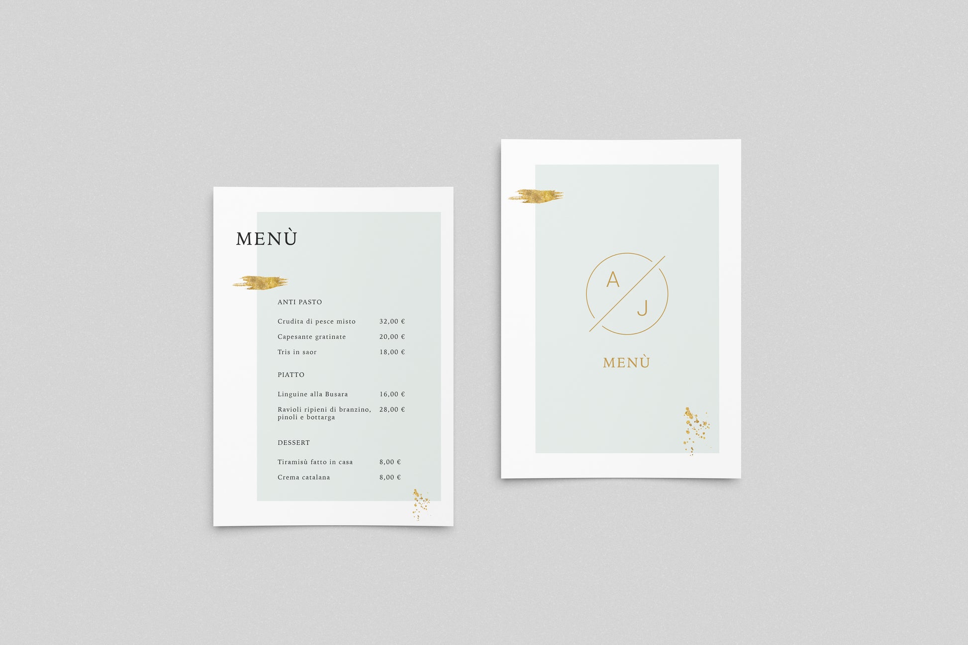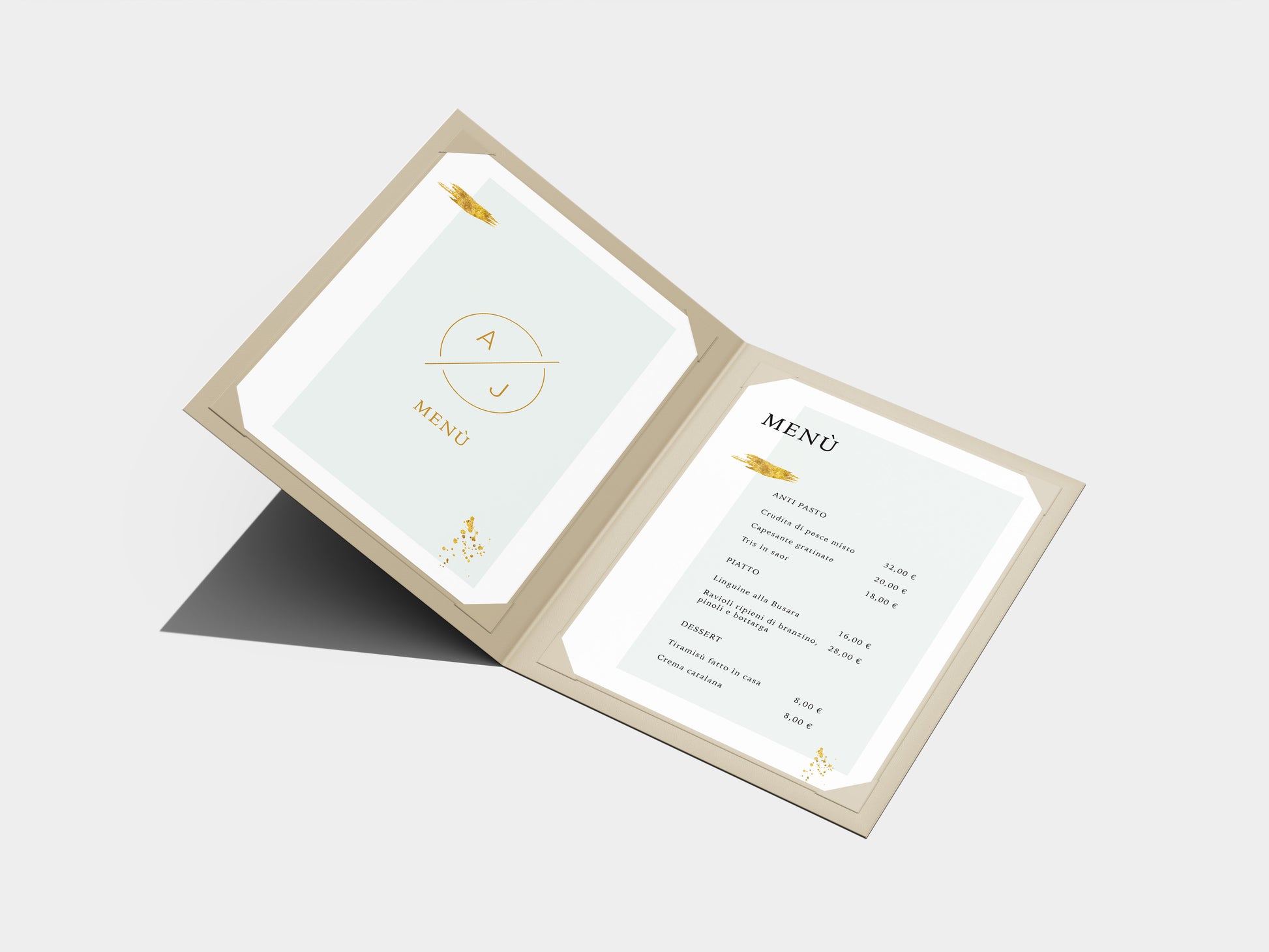 This artwork features a refined soft-mint background framed in white, paired with delicate gold-foil style accents. The front cover displays a clean circular monogram layout with the letters A / J, while the interior page showcases a sophisticated Italian menu set in modern serif typography. The combination of pale tones, structured layout, and subtle gold details creates a premium, upscale dining aesthetic suitable for high-end restaurant scenes.