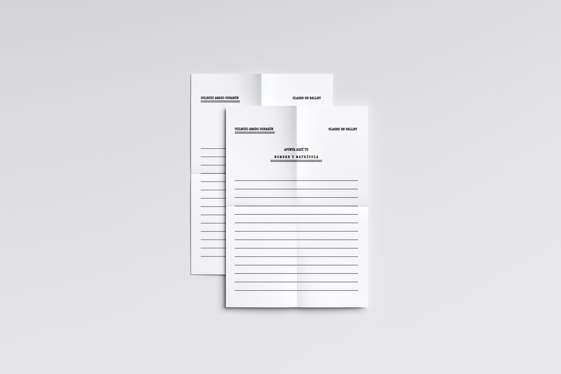 This minimalist black-and-white sheet features the retro header “Colegio Amado Corazón – Clases de Ballet” and a central prompt instructing students to write their name and enrollment number. The lined section below mimics an old-style attendance or sign-up sheet, giving it an authentic institutional look reminiscent of classic Latin American school paperwork.