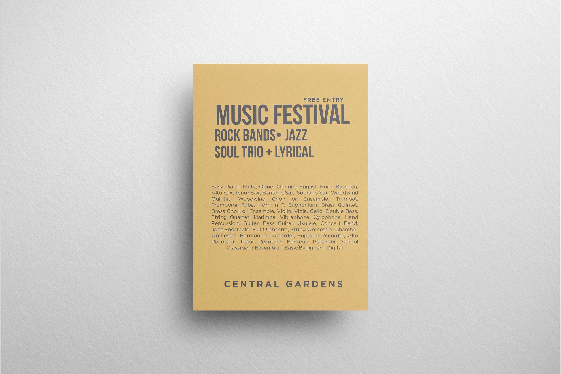 A clean and modern music festival poster designed in a bold, minimalist style. Set against a warm mustard-yellow background, the layout features sharp, condensed typography announcing a variety of live music acts including rock bands, jazz groups, and soul/lyrical performances. The lower portion includes an extensive list of musical instruments, giving the poster an authentic institutional or community-event feel.