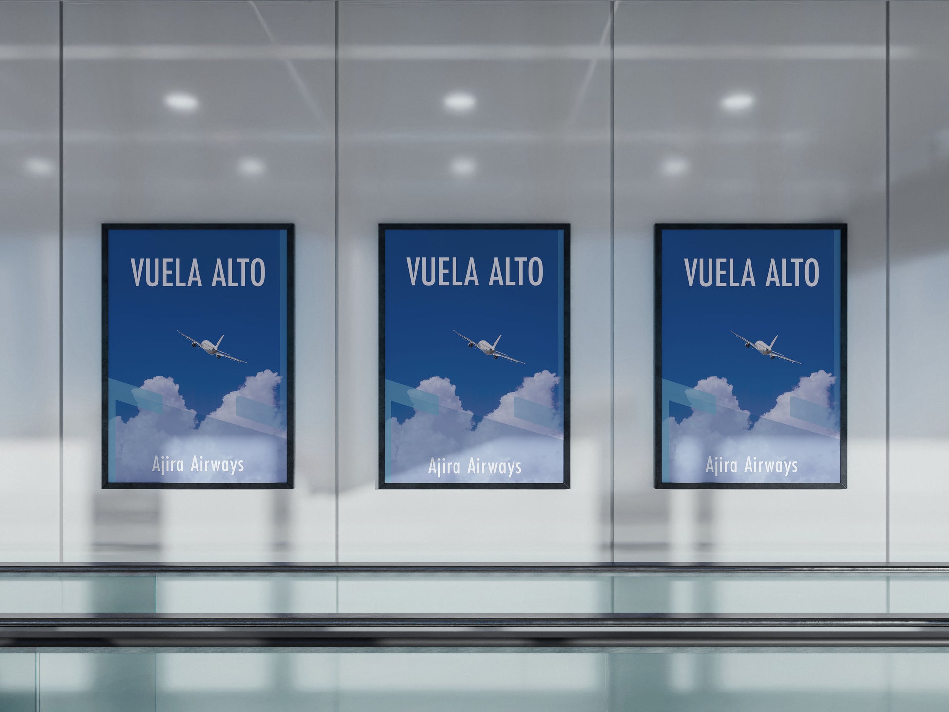 A retro-inspired airport advertisement poster, designed to evoke the golden age of air travel. Featuring the phrase "Vuela Alto" (Fly High) in bold, modern typography, and showcasing an airplane soaring through a clear blue sky with soft clouds, this piece captures a sense of adventure and excitement. The minimalistic and clean design, enhanced with geometric color blocks, makes it a perfect addition to any space with a travel or aviation theme.