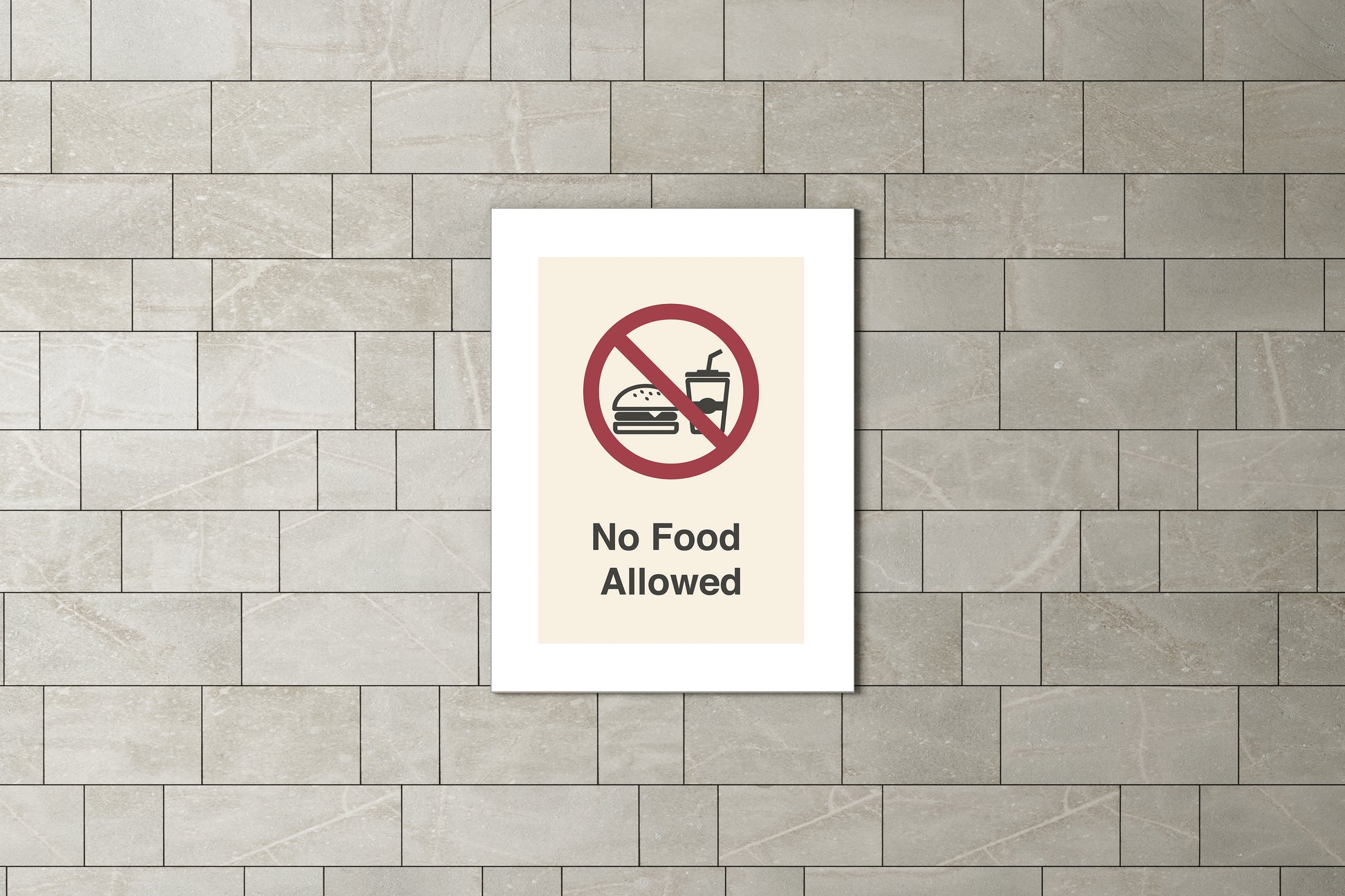 This artwork captures the classic look of metro and transportation system warning signs. It features a bold “No Food Allowed” message with a clear prohibition symbol over simple food icons, all set on a neutral background. Its clean, utilitarian aesthetic makes it ideal for creating believable transit environments or institutional spaces in film, TV, and theater.