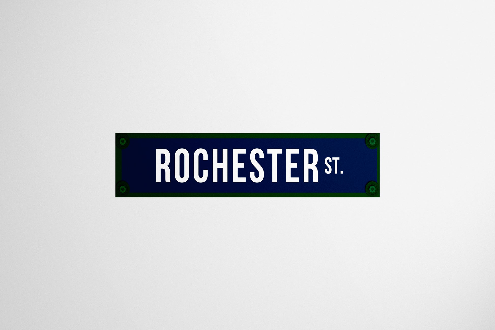This piece features a bold navy-blue street plaque with crisp white lettering reading “Rochester St.”, framed by a deep green border and stylized screw details in each corner. Its minimalist yet realistic design makes it ideal for film sets, stage dressing, themed décor, or adding a subtle metropolitan touch to any space.