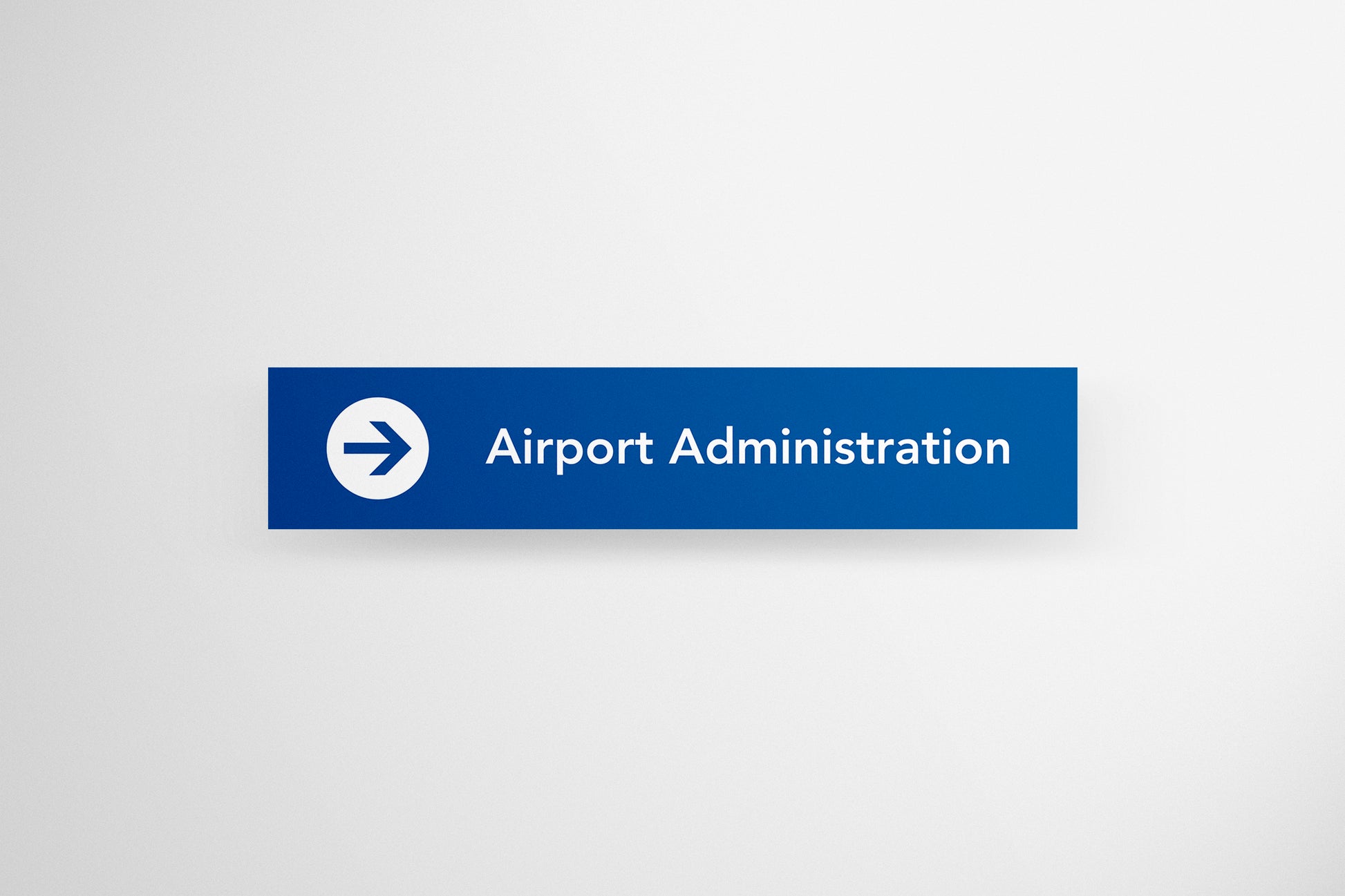 A clean and straightforward "Airport Administration" directional sign, perfect for creating a professional airport or corporate environment aesthetic. This design features a bold blue background with a white arrow pointing to the right and clear, minimalist typography. The simple yet effective use of color and symbols evokes the kind of signage you'd typically find directing staff and visitors to administrative areas within an airport or business complex.