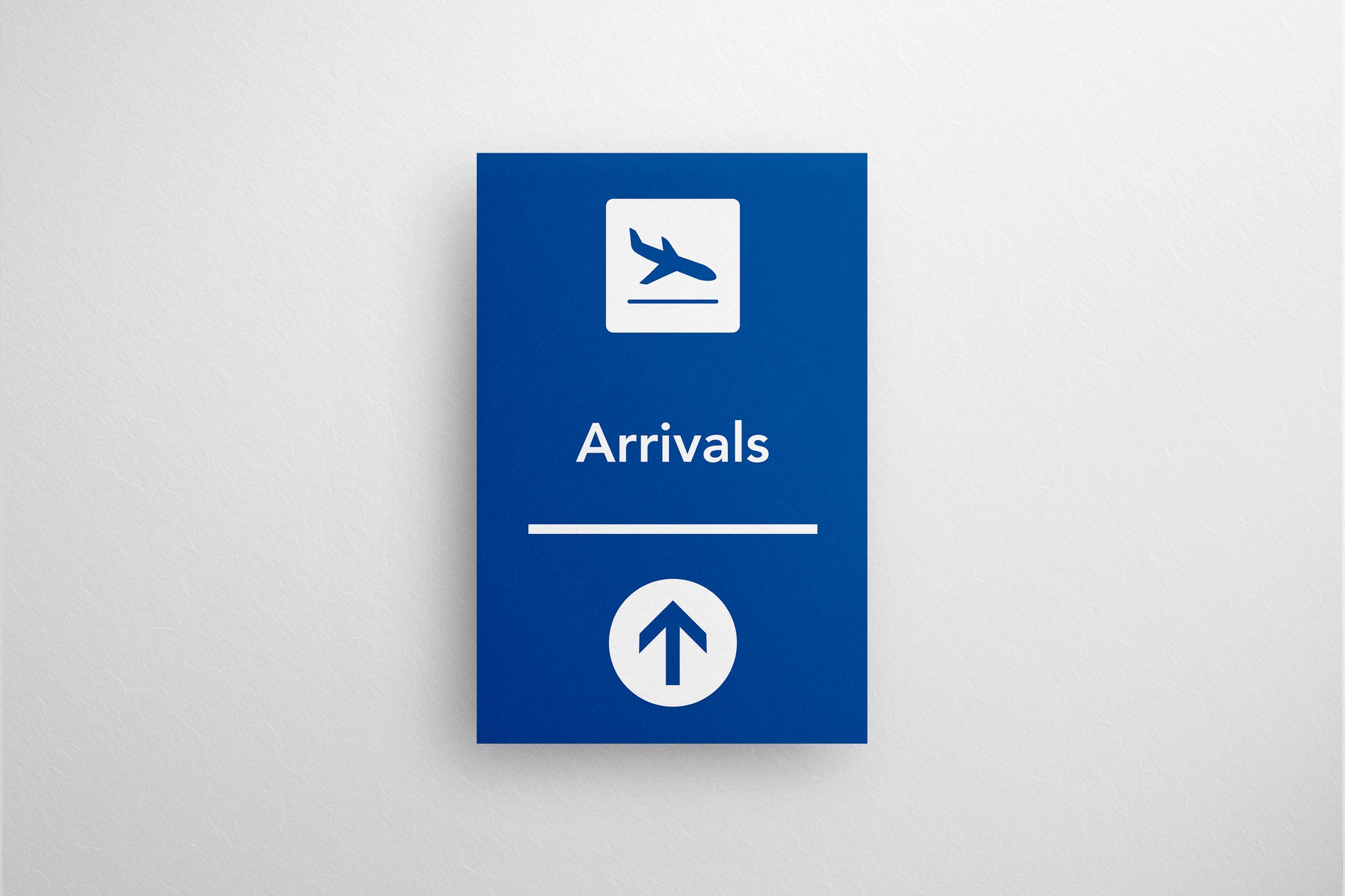 This artwork recreates the look of international airport wayfinding systems, featuring a bold blue background, a minimalist airplane icon, and clear “Arrivals” text in a universal sans-serif style. The crisp white directional arrow below adds authenticity, making it ideal for scenes set in terminals, transit hubs, or travel-related environments.