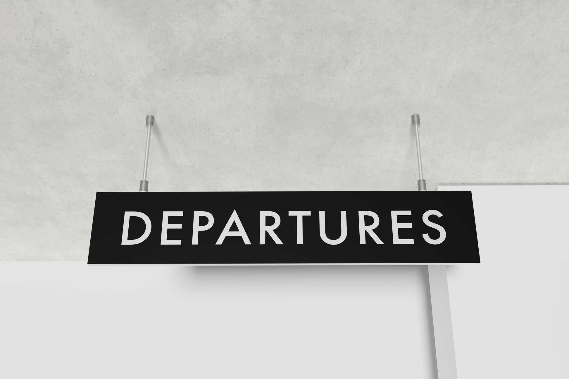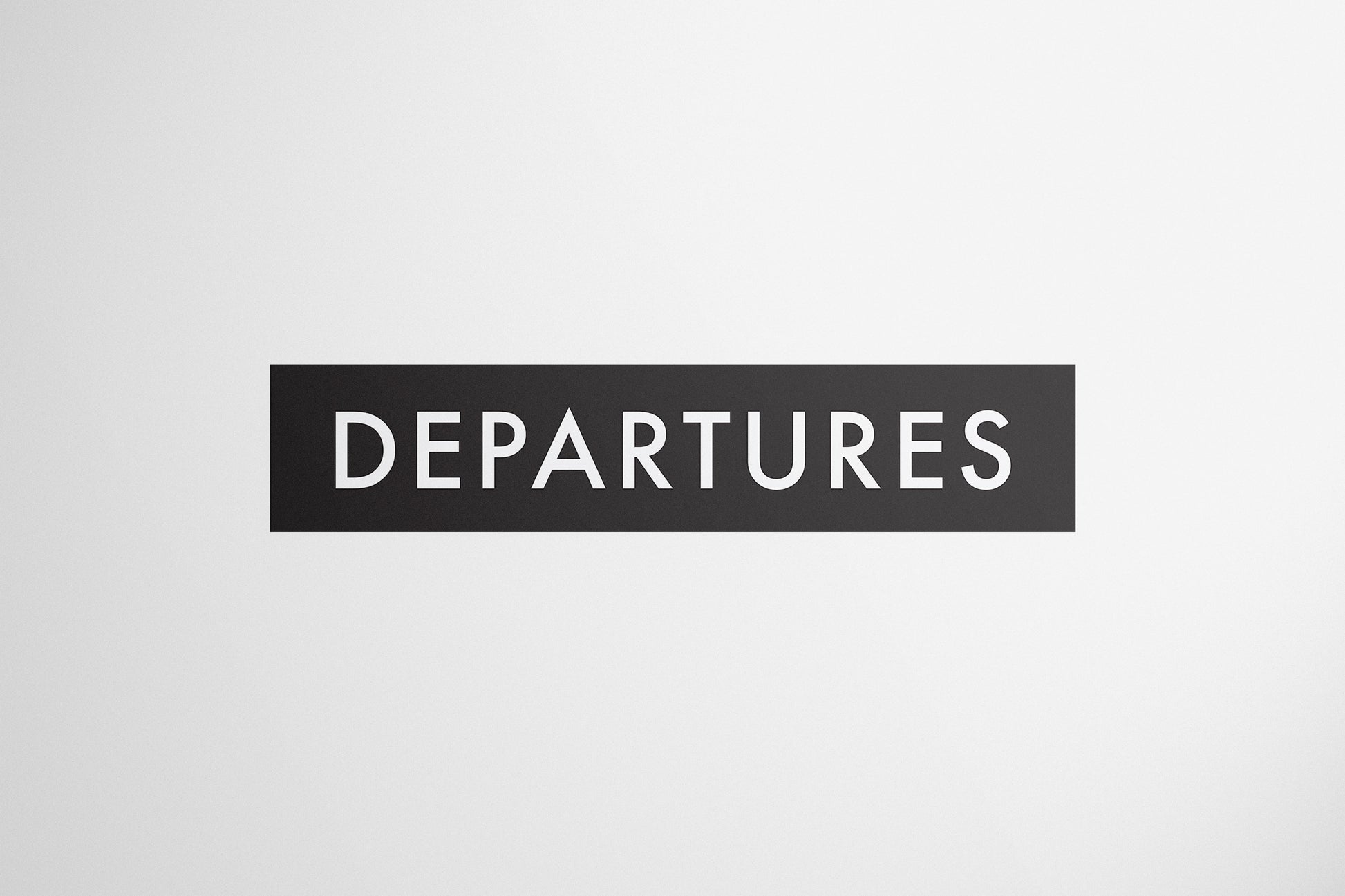 A clean, modern airport-style “DEPARTURES” sign designed as a versatile wall print or realistic stage/film prop. This minimalist black-and-white panel features crisp sans-serif lettering and a sleek horizontal layout, perfectly emulating contemporary terminal signage. Ideal for production designers, travel-themed décor, or anyone seeking a subtle graphic piece with a functional aesthetic.