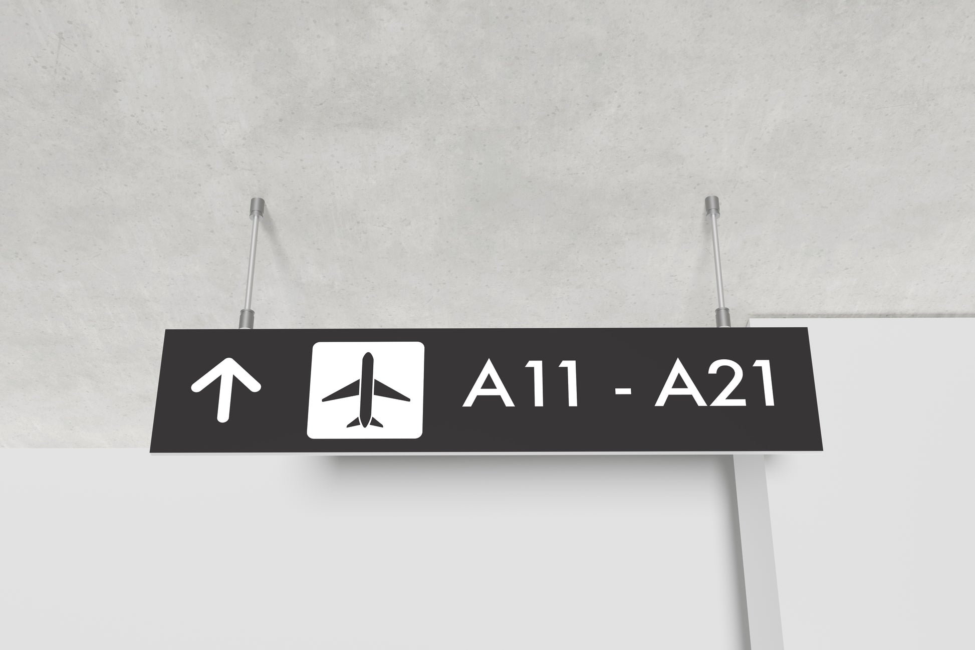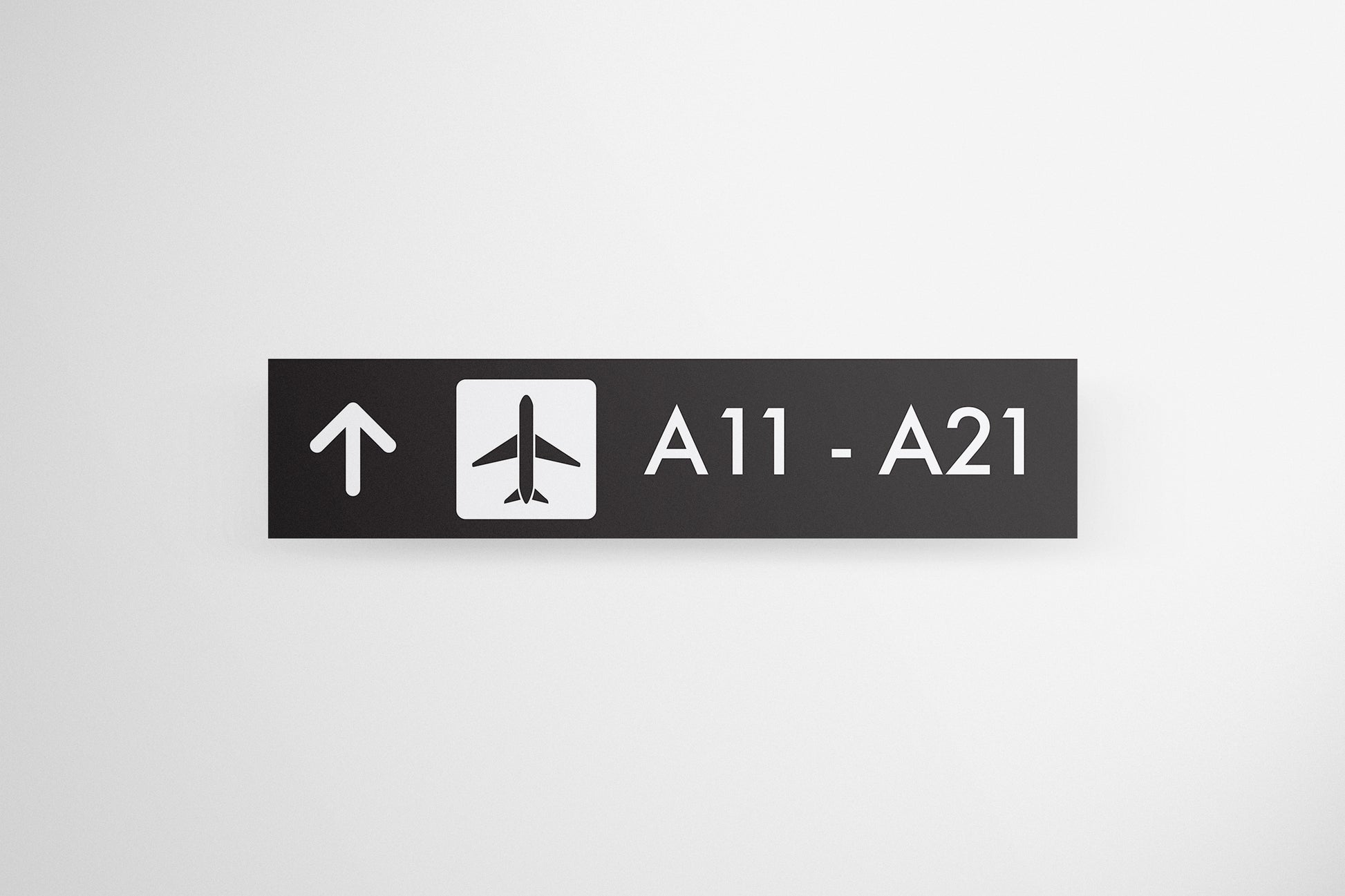 A sleek and minimalist airport gate sign, perfect for production design and set dressing. This sign features an upward arrow, an airplane icon, and clear text for gates A11 to A21, offering an authentic touch for any airport or travel-themed set. The bold black and white color scheme ensures high contrast, making it visually striking and easily recognizable in film or stage productions.