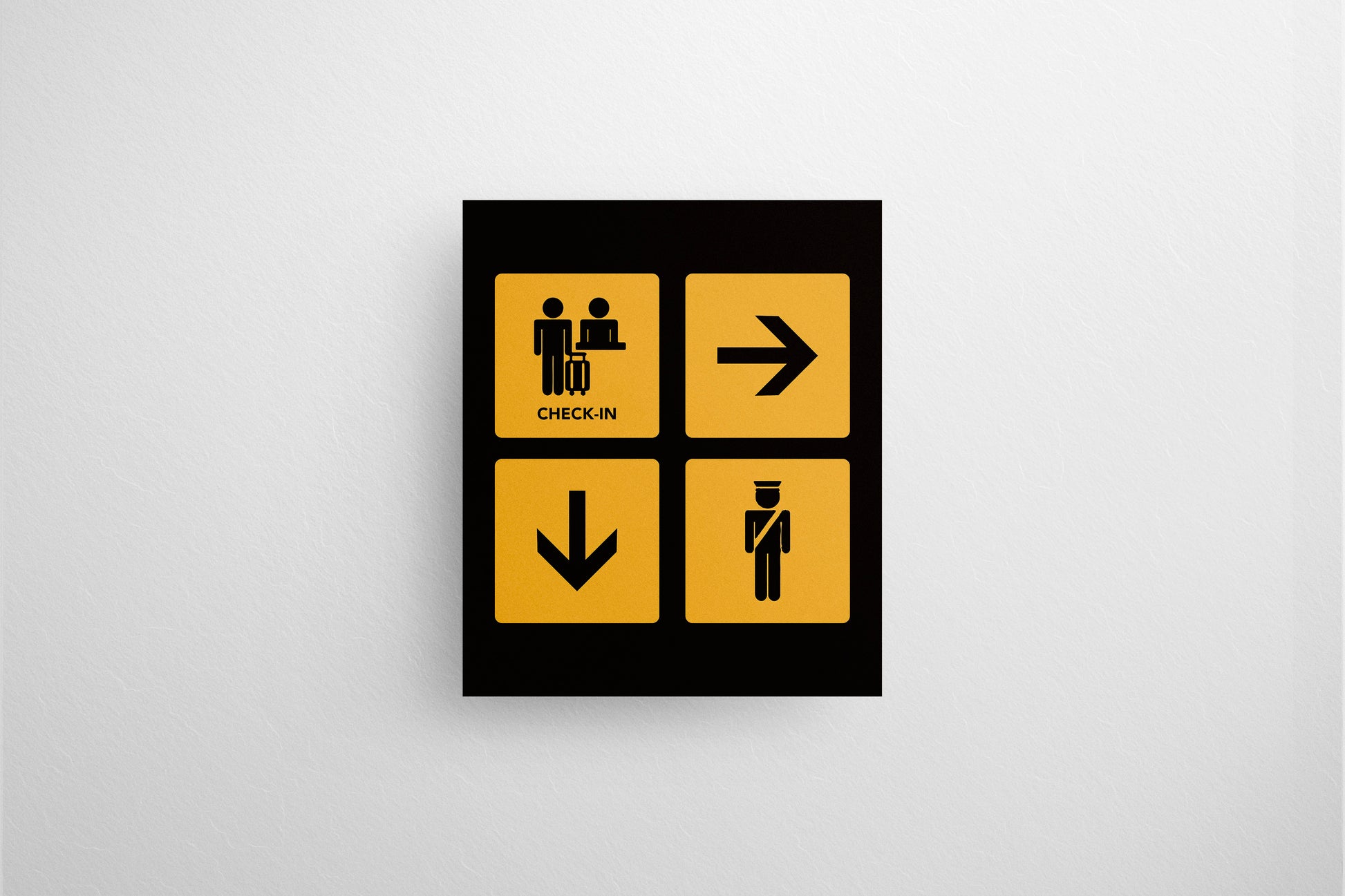 This artwork features a clean grid of four high-visibility yellow squares on a black background, each containing a bold icon: Check-In, Right Arrow, Down Arrow, and Security Officer. Designed to mimic real airport signage, the layout is crisp, functional, and instantly readable—ideal for production designers who need authentic environmental graphics for terminals, checkpoints, or contemporary public-space sets.