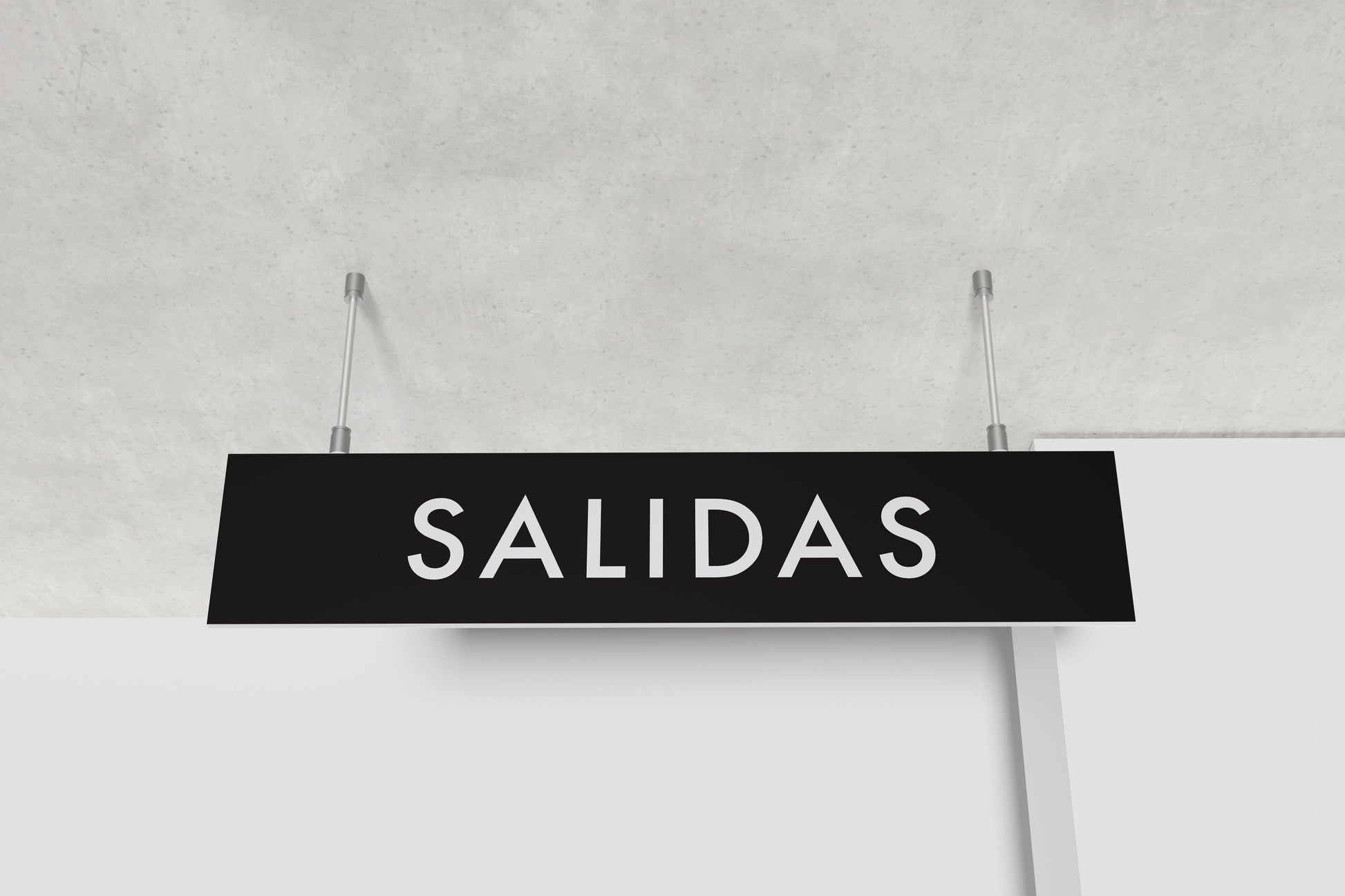 A sleek, modern airport-style “SALIDAS” sign designed as a realistic wall print or film/TV prop. This minimalist horizontal panel features clean sans-serif lettering set against a bold black bar, perfectly emulating contemporary international terminal signage. Its neutral, functional aesthetic makes it ideal for travel-themed décor, editorial sets, commercial environments, or production design requiring authentic wayfinding graphics in Spanish.