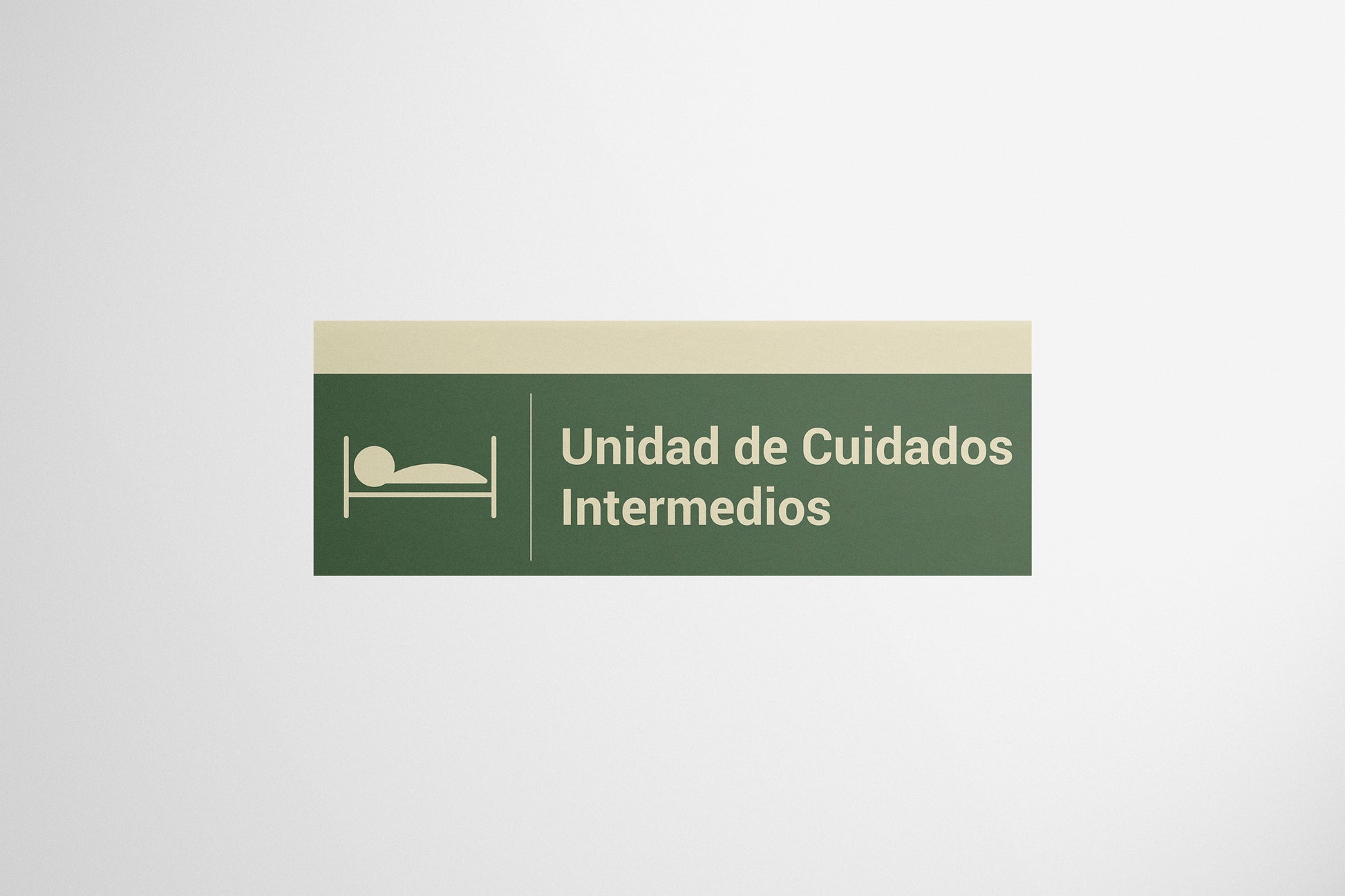 This artwork captures the understated, functional aesthetic of classic medical facility signs. Featuring a muted green background, cream-toned accents, and a simple icon of a patient resting in a bed beside the text “Unidad de Cuidados Intermedios,” it channels the clean visual language of institutional wayfinding. Its minimalist, slightly vintage look makes it ideal for set decoration requiring an authentic clinical atmosphere.