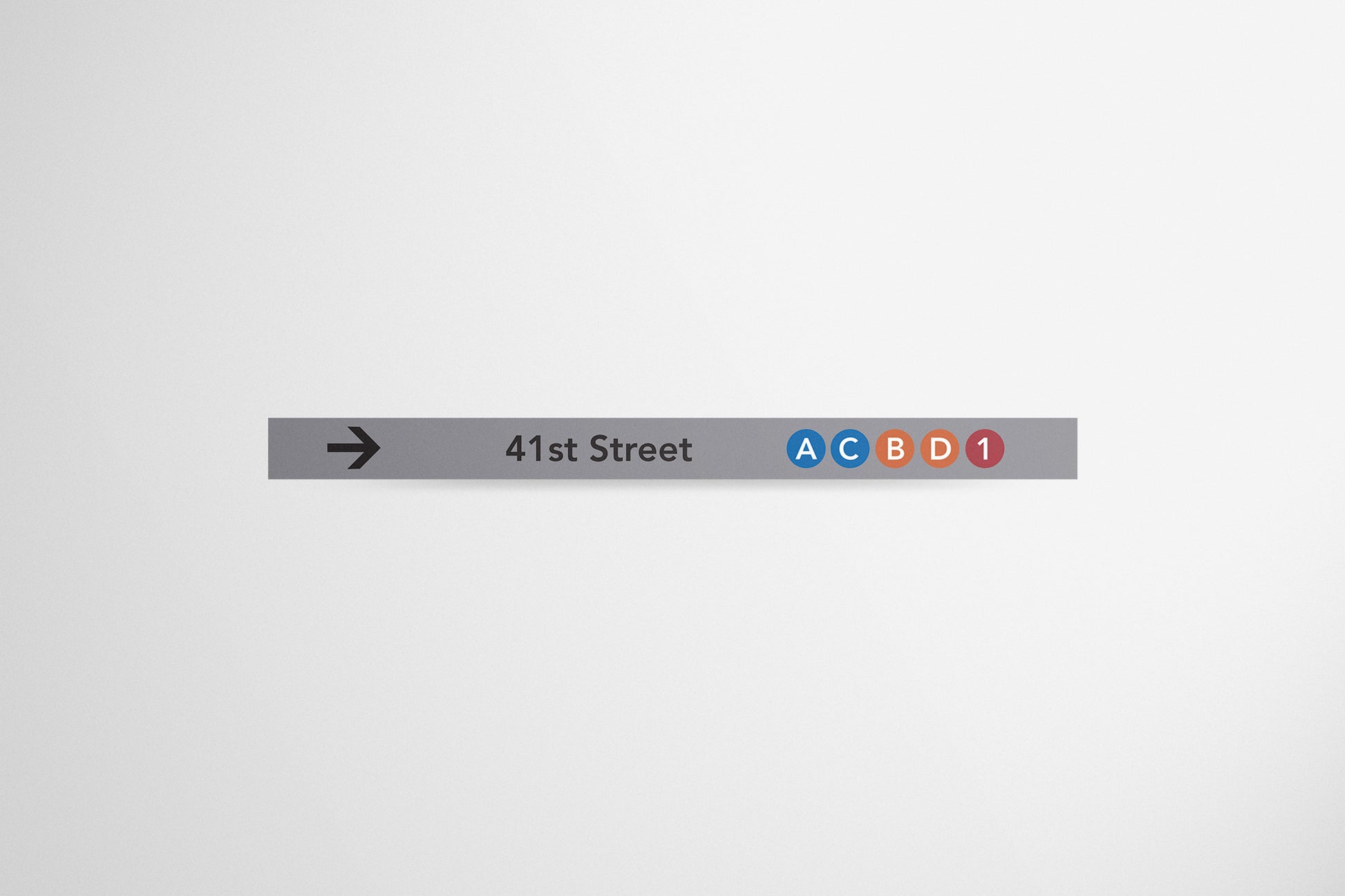 This piece recreates a clean, contemporary transit-system look featuring a right-facing arrow, “41st Street” text, and colored route circles. Its minimalist layout, neutral gray background, and crisp typography make it ideal for production design needing authentic metro signage without referencing any specific real-world system.