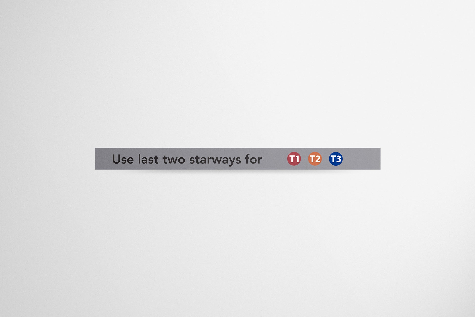 This piece recreates a station guidance sign, featuring a clean grey panel, bold sans-serif typography, and three colored route circles labeled T1, T2, and T3. The simple layout and color-coded markers evoke real metropolitan wayfinding systems, making it perfect for any scene set in a subway, transit terminal, or contemporary infrastructure environment.