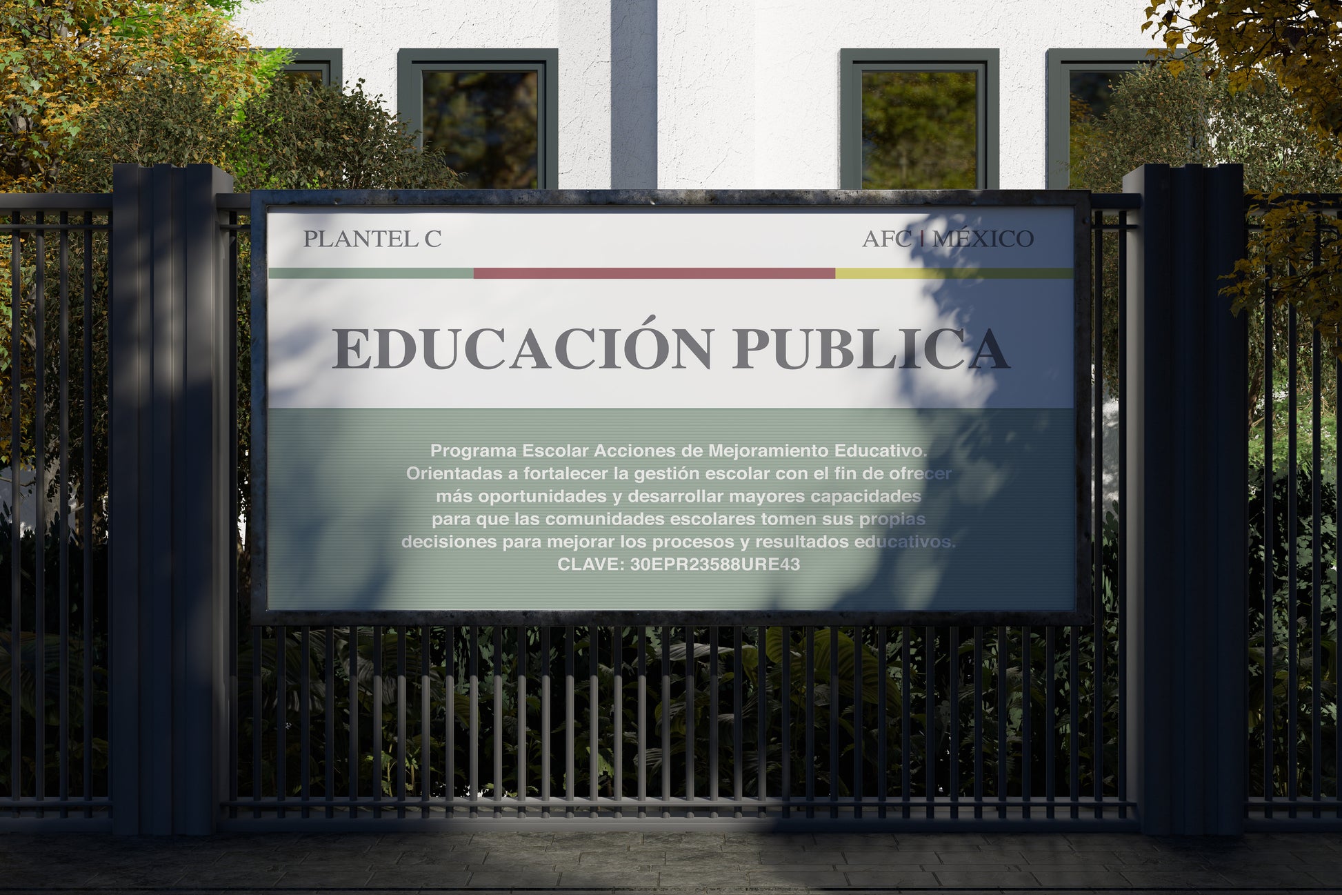 This artwork recreates the look of an official “Educación Pública” institutional sign commonly found in Mexican public schools. Designed with clean, formal typography and the characteristic green-red-yellow color bands, it evokes the understated yet iconic visual style of late-20th-century educational signage. The lower section includes a block of program text, adding authenticity for set dressing in classrooms, administrative offices, or public-building environments.