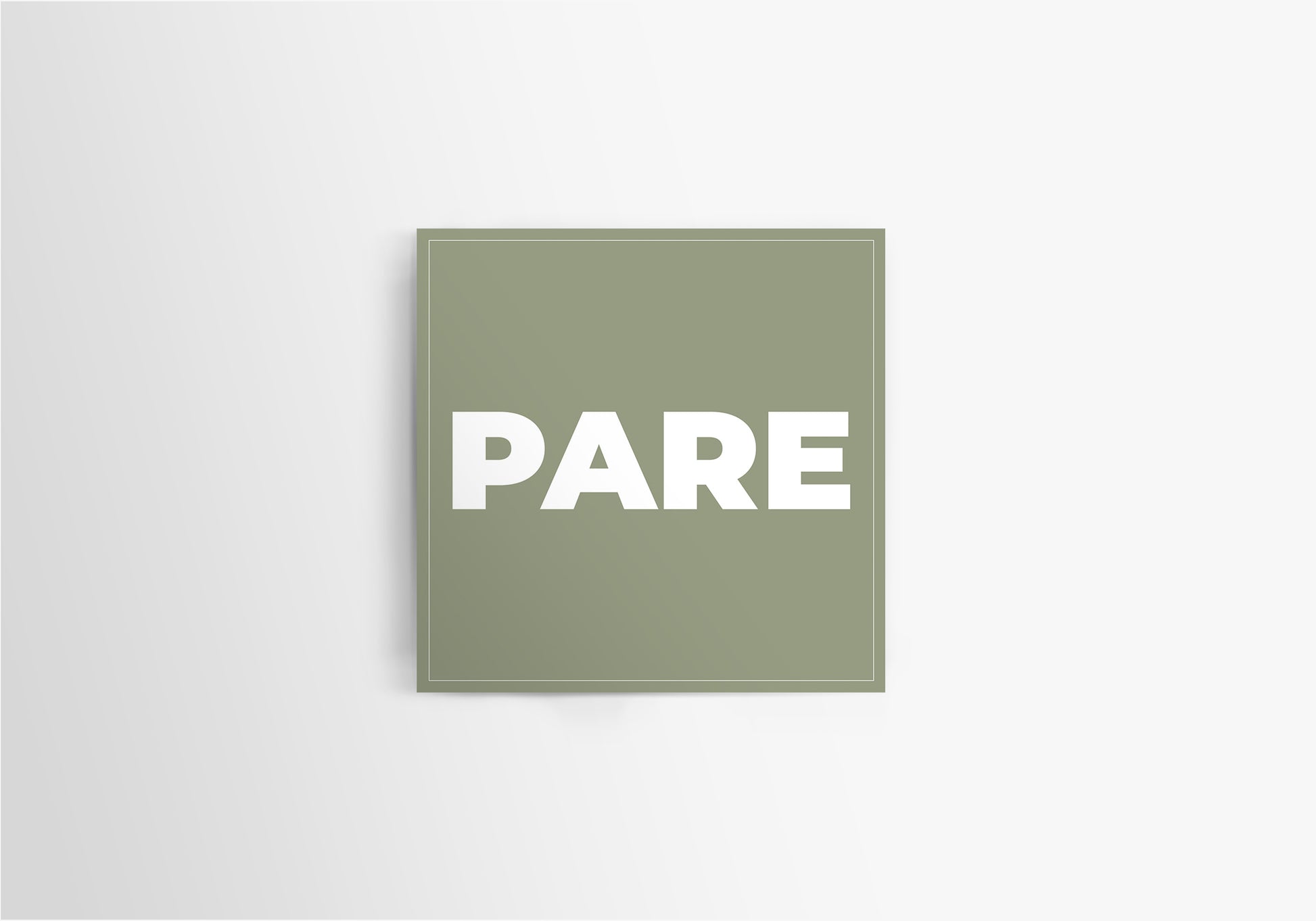 This artwork features the word “PARE” in strong white typography centered on a muted green background. The clean layout and high-contrast design make it instantly readable, evoking the look of real-world traffic or industrial signage. Its minimalist aesthetic makes it ideal for production sets, urban-themed décor, or any setting that needs an authentic stop-signal prop.