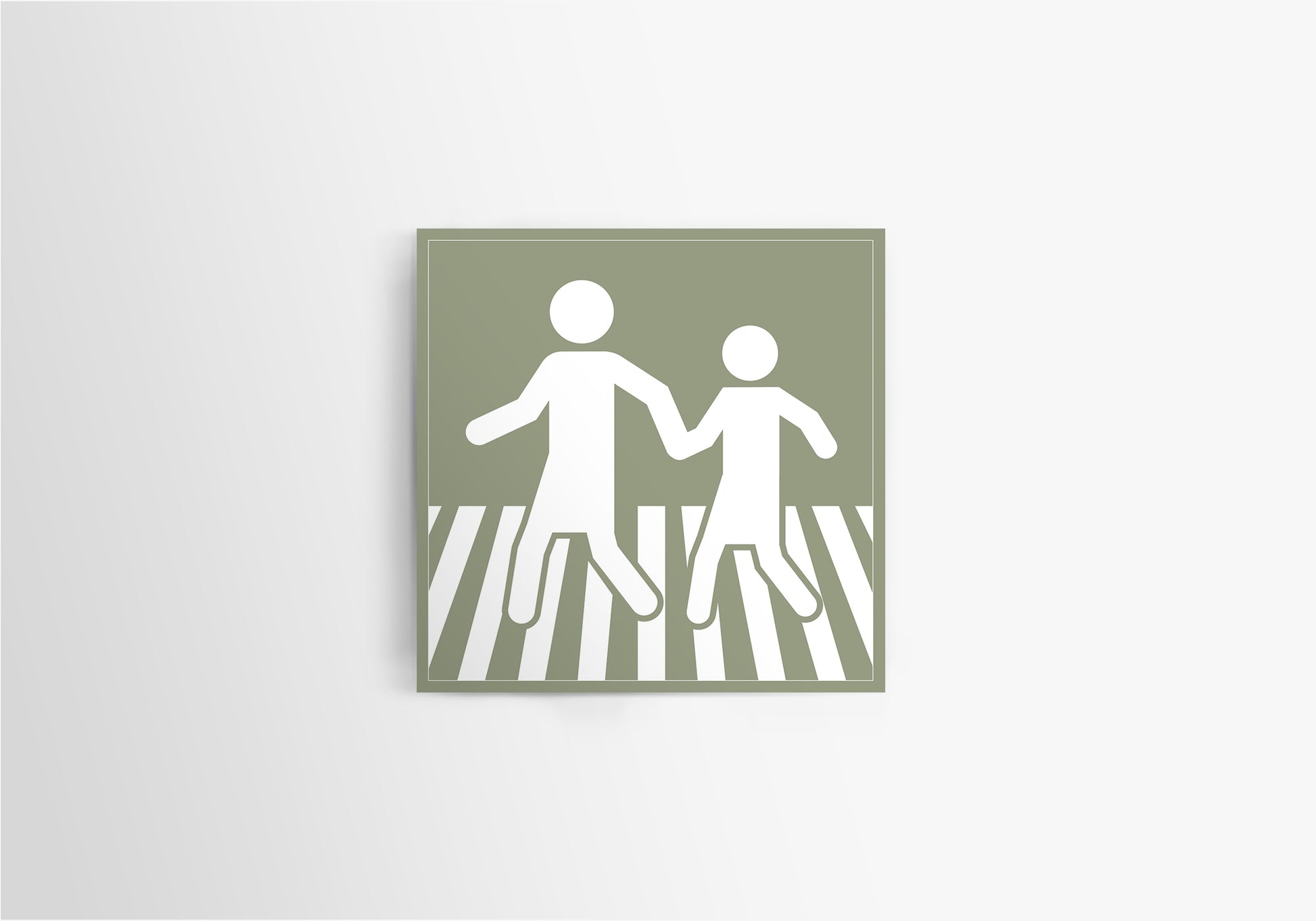 This design features two simplified human figures holding hands while walking across a zebra crossing, rendered in bold white silhouettes over a muted olive-green background. The minimal pictogram style and thin border give it an authentic public-signage feel, ideal for contemporary city environments or production sets needing believable street graphics.