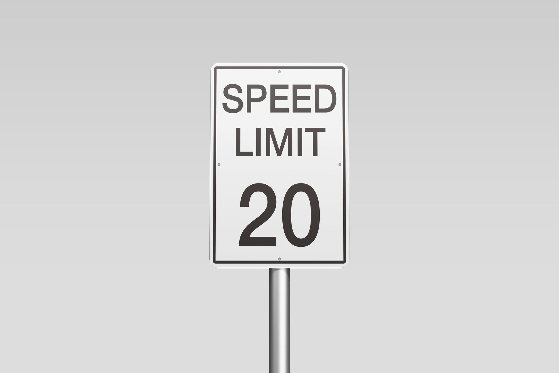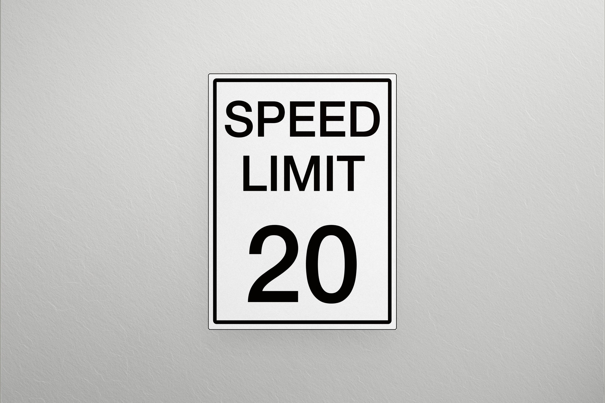 This artwork replicates a classic “SPEED LIMIT 20” road sign featuring bold black lettering and numerals on a bright white background. A thin black double-line border frames the design, giving it the unmistakable look of authentic street regulation signage. Its minimal, utilitarian style makes it perfect for production designers or anyone wanting an instantly recognizable traffic aesthetic.
